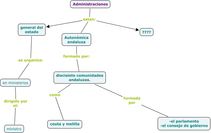 Este mapa conceptual tiene información relacionada a: Monica Bolaños Riveraa, Autonómica andaluza formado por: diecisiete comunidades andaluzas., Administraciones estan: general del estado, Administraciones estan: ????, Administraciones estan: Autonómica andaluza, en ministerios dirigido por el: ministro, diecisiete comunidades andaluzas. como ceuta y melilla, diecisiete comunidades andaluzas. formada por -el parlamento -el consejo de gobierno, general del estado se organiza: en ministerios