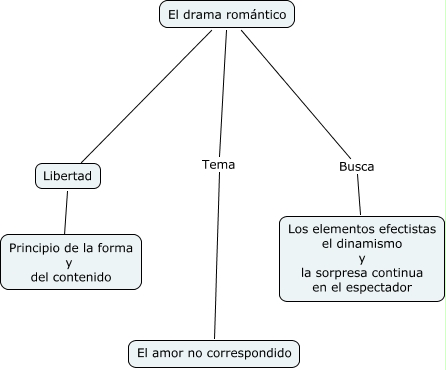 Este mapa conceptual tiene información relacionada a: el drama romántico, El drama romántico Busca Los elementos efectistas el dinamismo y la sorpresa continua en el espectador, El drama romántico Tema El amor no correspondido, El drama romántico ???? Libertad, Libertad ???? Principio de la forma y del contenido
