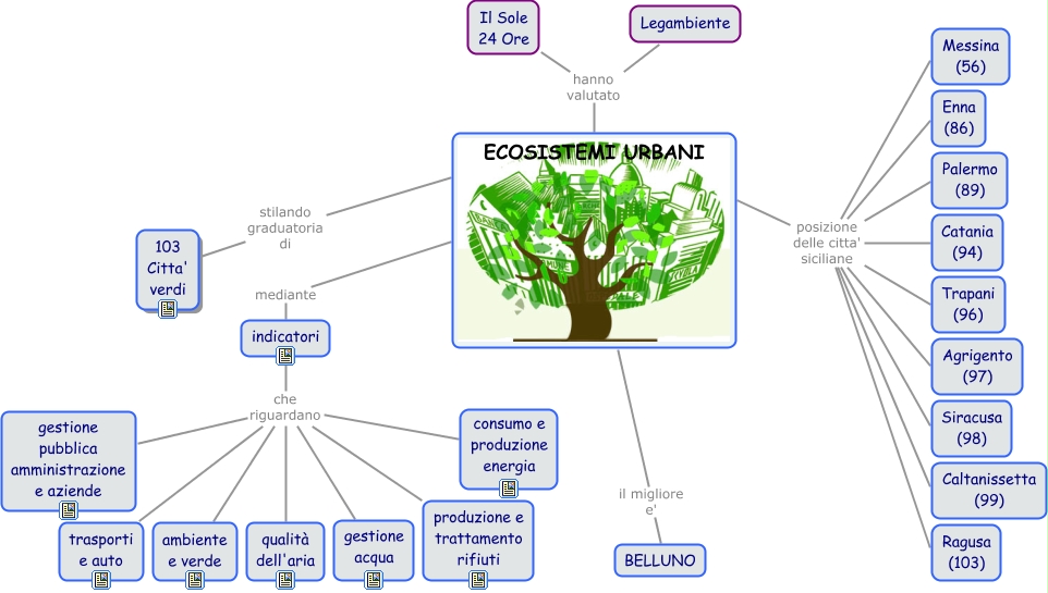 Questa Mappa Concettuale ha informazioni correlate a: ecosistema_urbano, Legambiente hanno valutato ECOSISTEMI URBANI, indicatori che riguardano qualità dell'aria, ECOSISTEMI URBANI stilando graduatoria di 103 Citta' verdi, indicatori che riguardano trasporti e auto, Il Sole 24 Ore hanno valutato ECOSISTEMI URBANI, ECOSISTEMI URBANI posizione delle citta' siciliane Caltanissetta (99), ECOSISTEMI URBANI posizione delle citta' siciliane Ragusa (103), ECOSISTEMI URBANI posizione delle citta' siciliane Trapani (96), indicatori che riguardano gestione pubblica amministrazione e aziende, ECOSISTEMI URBANI posizione delle citta' siciliane Siracusa (98)