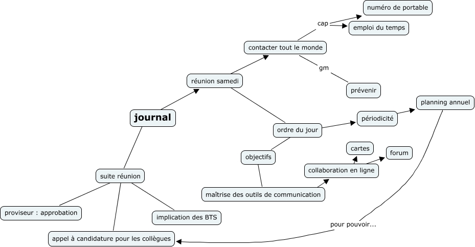 This Concept Map has information related to: journal, collaboration en ligne ???? cartes, collaboration en ligne ???? forum, objectifs ???? maîtrise des outils de communication, ordre du jour ???? objectifs, journal ???? réunion samedi, suite réunion ???? implication des BTS, maîtrise des outils de communication ???? collaboration en ligne, réunion samedi ???? ordre du jour, contacter tout le monde gm prévenir, contacter tout le monde cap numéro de portable