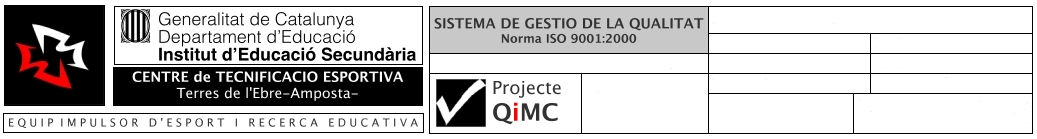 Abac.url Administració esportiva de la Generalitat de Catalunya.url Comissionat per a Universitat i Recerca.url Consejo Superior de Deportes.url Decret de regulació de plans estratègic.url Departament d'Educació.url Departament d'Educació de la Generalitat de Catalunya.url DOGC.Decret d'ordenació curricular ESO. (LOE).url facultat de Ciències de l'Educació i Psicologia.url Familia Professional d'activitats físiques i esportives.url Fitxa del Catàleg de Serveis sobre Plans Estratègics de centres.url Fitxa del procés P0101.url Fitxa de procés P0101.url FolletoSemInt.pdf Gestió academicoadministrativa de centre docents públics.url Gestió econòmica als centres docents públics.url Institut de Ciències de lEducació-URV.url Instruccions d'Organització i funcionament de centres docents.url kk.url Laboratario de Aplicaciones Telemáticas.url Ley Orgánica de Educación.(LOE).url Llibre d'actes del Consell Escolar.url logotip_IESDdE.gif Manual d'ús de la plataforma Camelot.url Manual de Serveis.url MEC.Consejo Superior de Deportes. Legislación deportiva.url Normativa de les pràctiques i estades a les empreses.url NRB_75x75.jpg Ordenació certificat de futbol.url Ordenació Certificat de Futbol Sala.url Ordenació dels ensenyaments de tècnic d'esports.url Ordenació del títol de tècnic de grau mitjà.url Ordenació del títol de tècnic superior.url Ordenació Tècnic d'esport de Futbol Sala.url Ordenació Tècnic d'esport en Futbol.url ORDRE reguladora de creació del Projecte QiMC.url Pautes per a l'elaboració del plans d'emergència.url Projecte QiMC.url qualitat.jpg RESOLUCIÓ Convocatòria d'autorització de plans estratègics.url RESOLUCIÓ Convocatòria de selecció de centres al Projecte QiMC.url SGQ_caixeti.jpg SGQ_logo_i_caixeti.jpg SGQ_MAPclients_000000.cmap SGQ_MAPcomunicacio_000000.cmap SGQ_MAPdocuments_000000.cmap SGQ_MAPdocuments_010000.cmap SGQ_MAPdocuments_010100.cmap SGQ_MAPdocuments_010101.cmap SGQ_MAPdocuments_010102.cmap SGQ_MAPdocuments_010103.cmap SGQ_MAPdocuments_020000.cmap SGQ_MAPdocuments_020100.cmap SGQ_MAPdocuments_030000.cmap SGQ_MAPdocuments_040000.cmap SGQ_MAPdocuments_050000.cmap SGQ_MAPdocuments_060000.cmap SGQ_MAPdocuments_070000.cmap SGQ_MAPdocuments_080000.cmap SGQ_MAPdocuments_090000.cmap SGQ_MAPdocuments_090100.cmap SGQ_MAPorganigrama_000000.cmap SGQ_MAPorganigrama_000001.cmap SGQ_MAPprocessos_000000.cmap SGQ_MAPprocessos_010000.cmap SGQ_MAPprocessos_010100.cmap SGQ_MAPprocessos_010103.cmap SGQ_MAPprocessos_020000.cmap SGQ_MAPprocessos_030000.cmap SGQ_MAPprocessos_nivell1.cmap SGQ_MAPresponsables_000000.cmap SGQ_MAPresponsables_010000.cmap SGQ_MAPresponsables_010100.cmap SGQ_MAPresponsables_020000.cmap SGQ_MAPresponsables_030000.cmap SGQ_MAPresponsables_040000.cmap Universitat Rovira i Virgili.url Xarxa QiMC.url