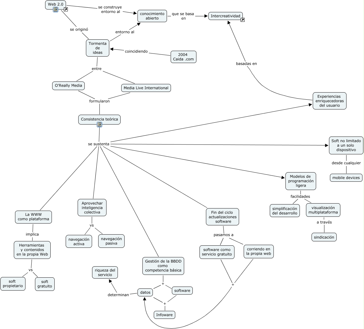 Este mapa conceptual tiene información relacionada a: Web 20, Herramientas y contenidos en la propia Web vs soft propietario, Fin del ciclo actualizaciones software pasamos a software como servicio gratuito, Herramientas y contenidos en la propia Web vs soft gratuito, O'Really Media formularon Consistencia teórica, Consistencia teórica se sustenta Experiencias enriquecedoras del usuario, Modelos de programación ligera facilidades simplificación del desarrollo, corriendo en la propia web + datos, software como servicio gratuito + datos, software + Infoware, Gestión de la BBDD como competencia básica + datos