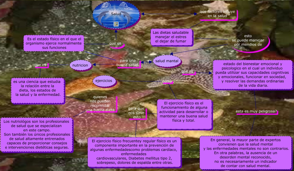 salud, estado del bienestar emocional y psicologico en el cual un individuo pueda utilizar sus capacidades cognitivas y emocionales, funcionar en sociedad, y resolver las demandas ordinarias de la vida diaria. esta es muy peligrosa? En general, la mayor parte de expertos convienen que la salud mental y las enfermedades mentales no son contrarios. En otra palabras, la ausencia de un desorden mental reconocido, no es necesariamente un indicador de contar con salud mental., Es el estado físico en el que el organismo ejerce normalmente sus funciones para una buena salud ejercicios, Es el estado físico en el que el organismo ejerce normalmente sus funciones para una buena salud nutricion, nutricion que es es una ciencia que estudia la relación entre la dieta, los estados de la salud y la enfermedad., ejercicios como El ejercicio físico es el funcionamiento de alguna actividad para desarrollar o mantener una buena salud física y total., El ejercicio físico es el funcionamiento de alguna actividad para desarrollar o mantener una buena salud física y total. para que nos sirve esto El ejercicio físico frecuentey regular físico es un componente importante en la prevención de algunas enfermedadescomo problemas cardíaco, enfermedades cardiovasculares, Diabetes mellitus tipo 2, sobrepeso, dolores de espalda entre otras., es una ciencia que estudia la relación entre la dieta, los estados de la salud y la enfermedad. quienes nos pueden recomndar una buena dieta Los nutriológos son los profesionales de salud que se especializan en este campo. Son también los únicos profesionales de salud altamente entrenados capaces de proporcionar consejos e intervenciones dietéticas seguras., Es el estado físico en el que el organismo ejerce normalmente sus funciones para una buena salud salud mantal, salud mantal que es estado del bienestar emocional y psicologico en el cual un individuo pueda utilizar sus capacidades cognitivas y emocionales, funcionar en sociedad, y resolver las demandas ordinarias de la vida diaria., Es el estado físico en el que el organismo ejerce normalmente sus funciones que es Salud