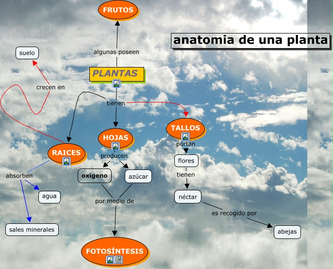 Este mapa conceptual tiene información relacionada a: LAS PLANTAS, RAICES absorben sales minerales, azúcar por medio de FOTOSÍNTESIS, PLANTAS algunas poseen FRUTOS, HOJAS producen azúcar, oxígeno por medio de FOTOSÍNTESIS, flores tienen néctar, PLANTAS tienen RAICES, HOJAS producen oxígeno, RAICES absorben agua, néctar es recogido por abejas
