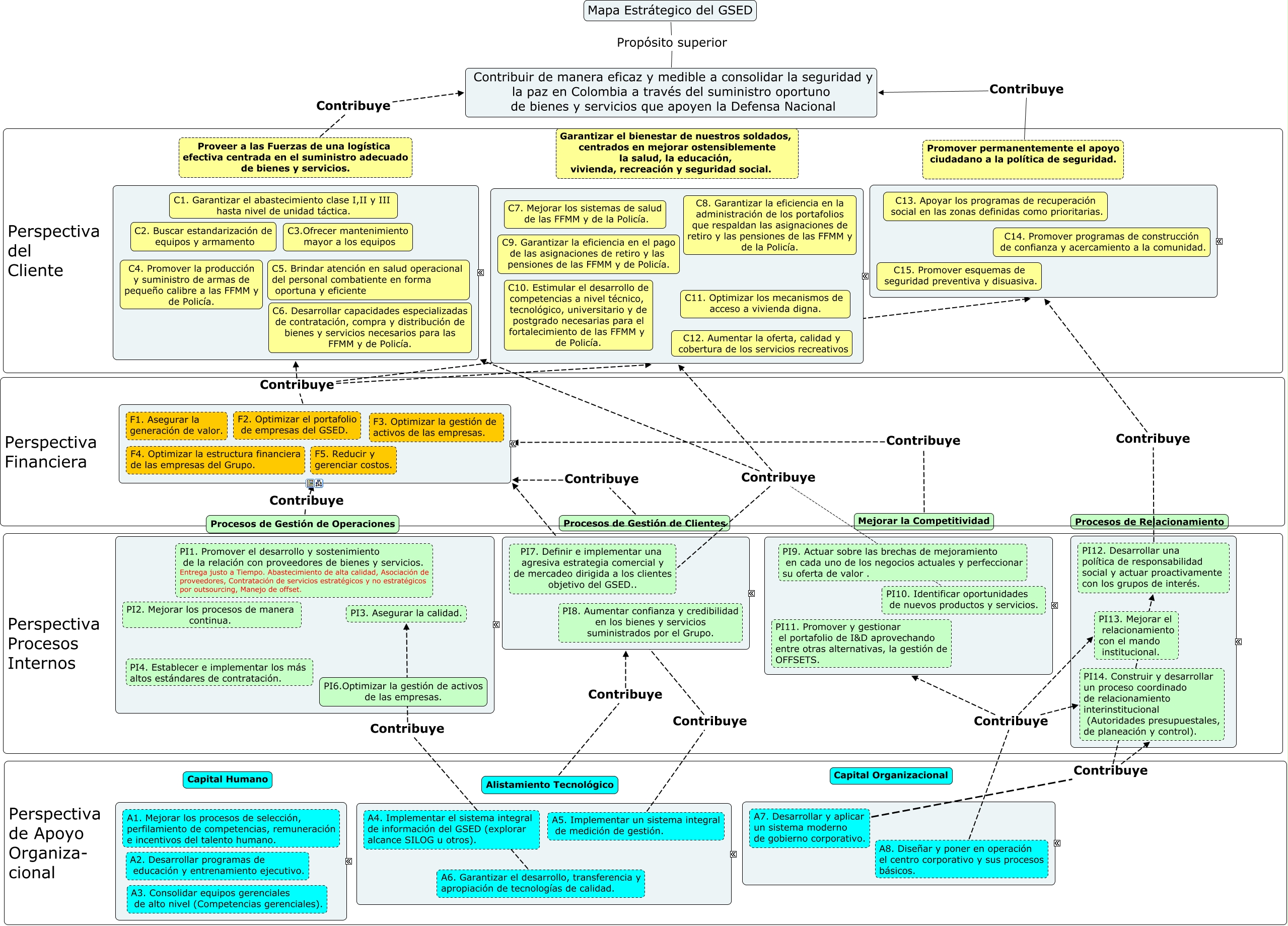 Este mapa conceptual tiene información relacionada a: Formulacion Estrategica, Promover permanentemente el apoyo ciudadano a la política de seguridad. Contribuye Contribuir de manera eficaz y medible a consolidar la seguridad y la paz en Colombia a través del suministro oportuno de bienes y servicios que apoyen la Defensa Nacional, Procesos de Gestión de Operaciones Contribuye ????, PI10. Identificar oportunidades de nuevos productos y servicios. Contribuye ????, A5. Implementar un sistema integral de medición de gestión. Contribuye ????, Alistamiento Tecnológico Contribuye ????, ???? Contribuye ????, A8. Diseñar y poner en operación el centro corporativo y sus procesos básicos. Contribuye ????, ???? Contribuye ????, Procesos de Gestión de Clientes Contribuye ????, Mejorar la Competitividad Contribuye ????