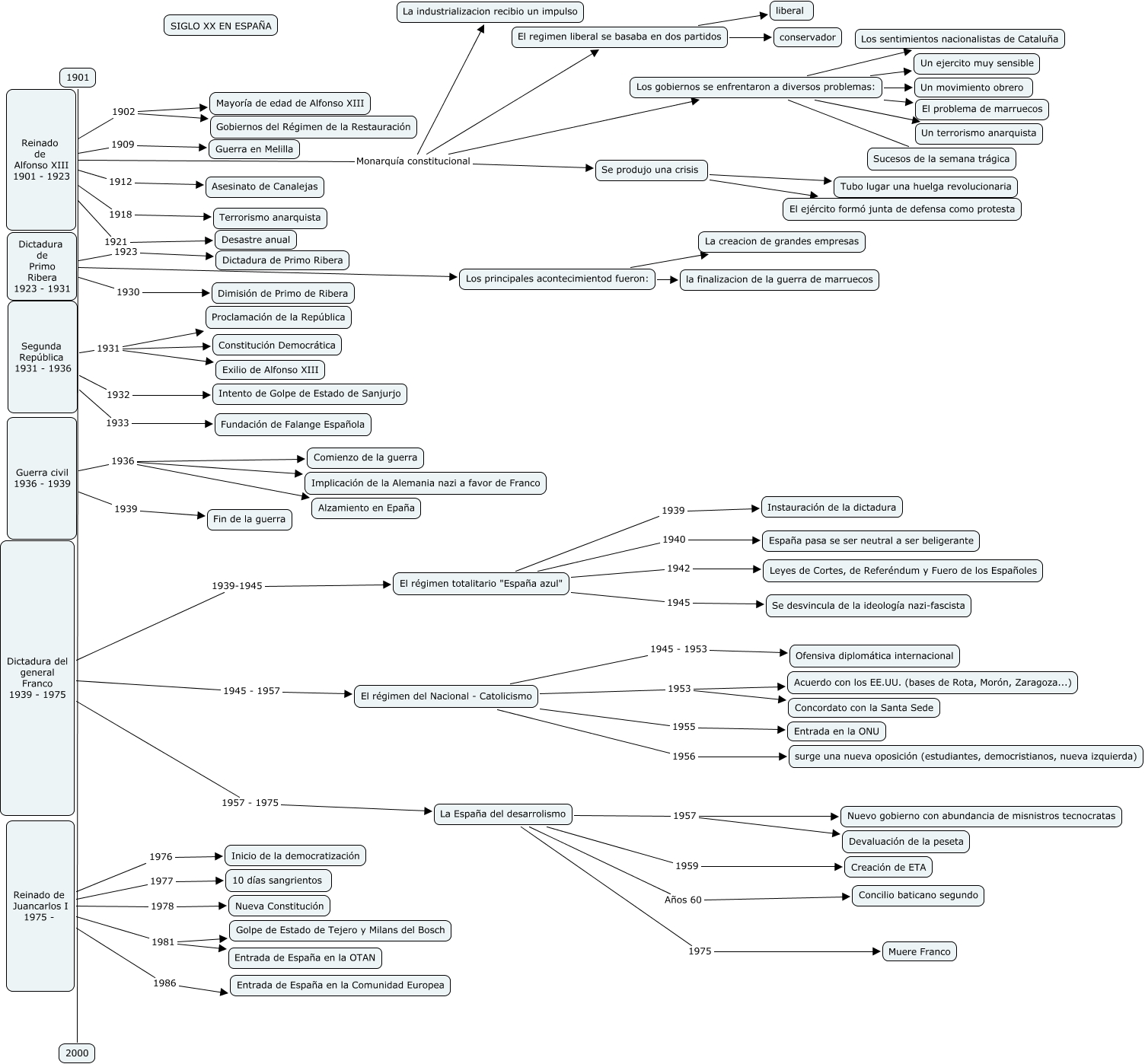 Este mapa conceptual tiene información relacionada a: 06.Daniel Coca Aragón.España s.XX, Reinado de Alfonso XIII 1901 - 1923 1909 Guerra en Melilla, Segunda República 1931 - 1936 1931 Exilio de Alfonso XIII, Guerra civil 1936 - 1939 1939 Fin de la guerra, La España del desarrolismo 1975 Muere Franco, Los gobiernos se enfrentaron a diversos problemas: Un movimiento obrero, Segunda República 1931 - 1936 1932 Intento de Golpe de Estado de Sanjurjo, Reinado de Alfonso XIII 1901 - 1923 Monarquía constitucional Los gobiernos se enfrentaron a diversos problemas:, La España del desarrolismo 1959 Creación de ETA, Reinado de Alfonso XIII 1901 - 1923 Monarquía constitucional Se produjo una crisis, Dictadura del general Franco 1939 - 1975 1957 - 1975 La España del desarrolismo, Reinado de Alfonso XIII 1901 - 1923 Monarquía constitucional El regimen liberal se basaba en dos partidos, 1901 2000, Dictadura de Primo Ribera 1923 - 1931 1930 Dimisión de Primo de Ribera, El régimen del Nacional - Catolicismo 1956 surge una nueva oposición (estudiantes, democristianos, nueva izquierda), Reinado de Alfonso XIII 1901 - 1923 1902 Mayoría de edad de Alfonso XIII, Reinado de Juancarlos I 1975 - 1977 10 días sangrientos, Reinado de Alfonso XIII 1901 - 1923 1918 Terrorismo anarquista, El regimen liberal se basaba en dos partidos liberal, La España del desarrolismo Años 60 Concilio baticano segundo, Reinado de Alfonso XIII 1901 - 1923 1921 Desastre anual
