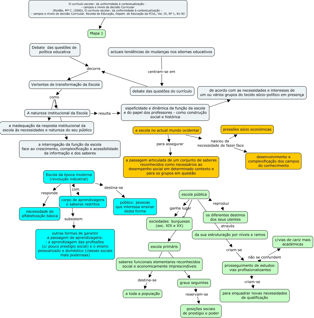 Este Mapa Conceitual tem informações relacionadas a: Currículo - da uniformidade a contextuàlização_Roldão, escola pública ganha lugar sociedades burguesas (sec. XIX e XX), escola pública reproduz os diferentes destinos dos seus utentes, escola primáris destina-se a toda a população, escola primáris ???? graus seguintes, prosseguimento de estudos: vias profissionalizantes criam-se para enquadrar novas necessidades de qualificação, Escola da época moderna (revolução industrial) destina-se público: pessoas que interessa ensinar desta forma, debate das questões do currículo decorre Vertentes de transformação da Escola, os diferentes destinos dos seus utentes através da sua estruturação por níveis e ramos, Vertentes de transformação da Escola como A natureza institucional da Escola, Escola da época moderna (revolução industrial) responde necessidade de alfabetização básica