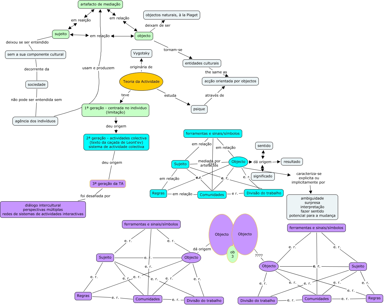 Este Mapa Conceitual tem informações relacionadas a: Expansive Learning - TA - Engestrom, Objecto e. r. Divisão do trabalho, objecto tornam-se entidades culturais, sujeito em relação objecto, Objecto dá origem resultado, Objecto ???? Objecto, 1ª geração - centrada no individuo (limitação) deu origem 2ª geração - actividades colectiva (texto da caçada de Leont'ev) sistema de actividade colectiva, objecto deixam de ser objectos naturais, à la Piaget, Teoria da Actividade estuda psique, Objecto dá origem sentido, agência dos indivíduos usam e produzem artefacto de mediação