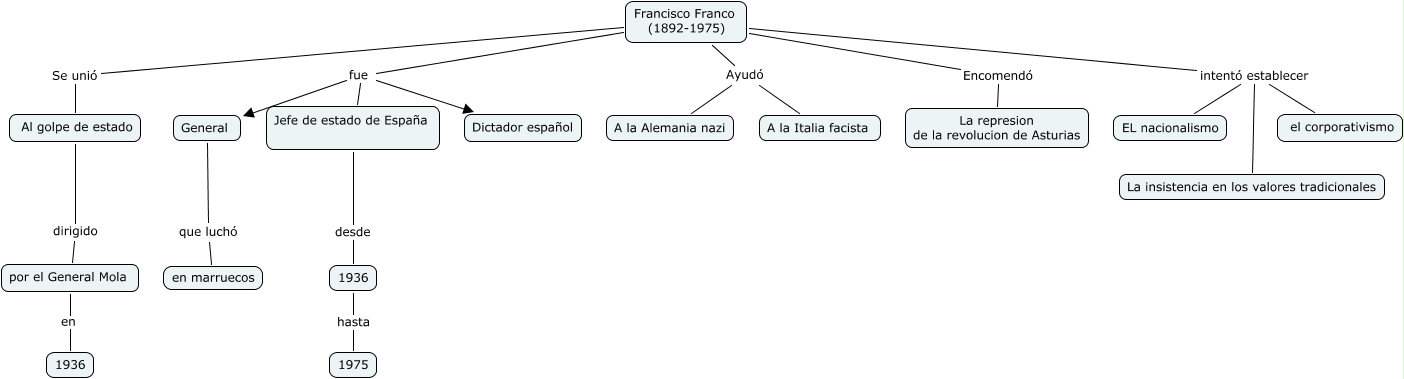 Este mapa conceptual tiene información relacionada a: 06.Daniel Coca Aragón.Franco, Francisco Franco (1892-1975) Se unió Al golpe de estado, Al golpe de estado dirigido por el General Mola, Francisco Franco (1892-1975) intentó establecer La insistencia en los valores tradicionales, Francisco Franco (1892-1975) fue General, Francisco Franco (1892-1975) fue Jefe de estado de España, Francisco Franco (1892-1975) Ayudó A la Italia facista, Francisco Franco (1892-1975) intentó establecer EL nacionalismo, Francisco Franco (1892-1975) fue Dictador español, Jefe de estado de España desde 1936, Francisco Franco (1892-1975) intentó establecer el corporativismo