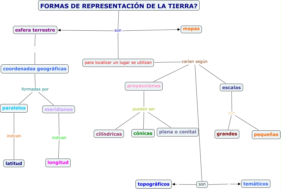 Este mapa conceptual tiene información relacionada a: tema 2 sociales 1º eso, meridianos indican longitud, coordenadas geográficas formadas por meridianos, para localizar un lugar se utilizan varían según son, paralelos indican latitud, escalas son pequeñas, coordenadas geográficas formadas por paralelos, proyecciones pueden ser plana o cenital, para localizar un lugar se utilizan varían según proyecciones, son temáticos, FORMAS DE REPRESENTACIÓN DE LA TIERRA? son para localizar un lugar se utilizan