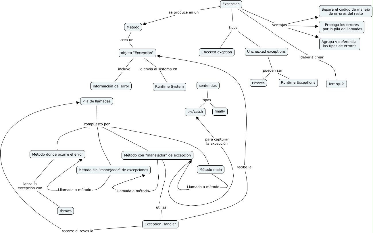 Este mapa conceptual tiene información relacionada a: java(fundamentos-java-4), Método sin "manejador" de excepciones Lllamada a método Método donde ocurre el error, Pila de llamadas compuesto por Método sin "manejador" de excepciones, Unchecked exceptions pueden ser Errores, Excepcion deberia crear Jerarquía, Método con "manejador" de excepción Llamada a método Método sin "manejador" de excepciones, Pila de llamadas compuesto por Método main, Excepcion tipos Unchecked exceptions, sentencias tipos try/catch, Excepcion ventajas Separa el código de manejo de errores del resto, Método con "manejador" de excepción utiliza Exception Handler