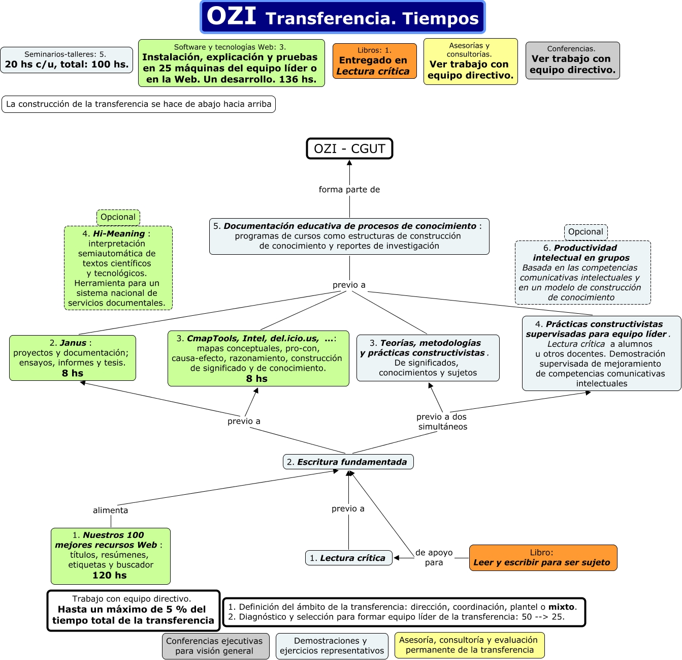 Este mapa conceptual tiene información relacionada a: 2. Esquema-transferencia-CGUT-Tiempos, 4. Prácticas constructivistas supervisadas para equipo líder. Lectura crítica a alumnos u otros docentes. Demostración supervisada de mejoramiento de competencias comunicativas intelectuales previo a 5. Documentación educativa de procesos de conocimiento: programas de cursos como estructuras de construcción de conocimiento y reportes de investigación, 3. CmapTools, Intel, del.icio.us, ...: mapas conceptuales, pro-con, causa-efecto, razonamiento, construcción de significado y de conocimiento. 8 hs previo a 5. Documentación educativa de procesos de conocimiento: programas de cursos como estructuras de construcción de conocimiento y reportes de investigación, Libro: Leer y escribir para ser sujeto de apoyo para 2. Escritura fundamentada, 2. Janus: proyectos y documentación; ensayos, informes y tesis. 8 hs previo a 5. Documentación educativa de procesos de conocimiento: programas de cursos como estructuras de construcción de conocimiento y reportes de investigación, 2. Escritura fundamentada previo a dos simultáneos 3. Teorías, metodologías y prácticas constructivistas. De significados, conocimientos y sujetos, 1. Nuestros 100 mejores recursos Web: títulos, resúmenes, etiquetas y buscador 120 hs alimenta 2. Escritura fundamentada, 5. Documentación educativa de procesos de conocimiento: programas de cursos como estructuras de construcción de conocimiento y reportes de investigación forma parte de OZI - CGUT, 2. Escritura fundamentada previo a dos simultáneos 4. Prácticas constructivistas supervisadas para equipo líder. Lectura crítica a alumnos u otros docentes. Demostración supervisada de mejoramiento de competencias comunicativas intelectuales, 3. Teorías, metodologías y prácticas constructivistas. De significados, conocimientos y sujetos previo a 5. Documentación educativa de procesos de conocimiento: programas de cursos como estructuras de construcción de conocimiento y reportes de investigación, 2. Escritura fundamentada previo a 3. CmapTools, Intel, del.icio.us, ...: mapas conceptuales, pro-con, causa-efecto, razonamiento, construcción de significado y de conocimiento. 8 hs