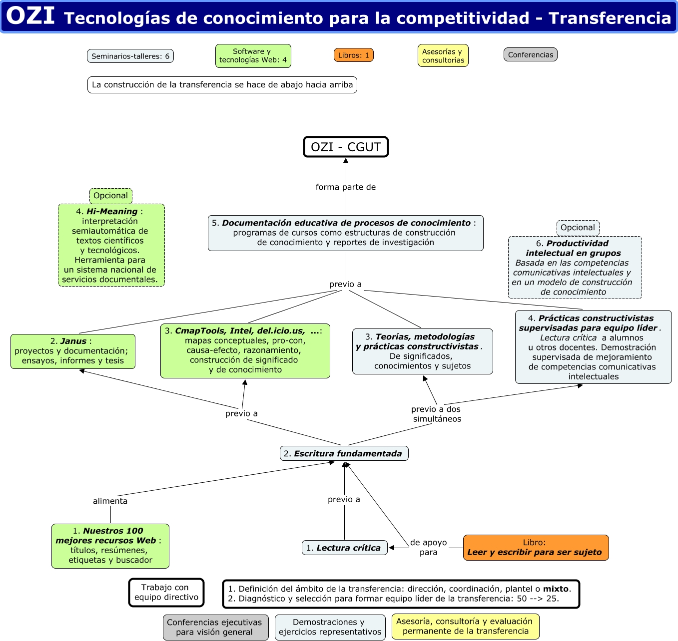 Este mapa conceptual tiene información relacionada a: 1. Esquema-transferencia-CGUT, 4. Prácticas constructivistas supervisadas para equipo líder. Lectura crítica a alumnos u otros docentes. Demostración supervisada de mejoramiento de competencias comunicativas intelectuales previo a 5. Documentación educativa de procesos de conocimiento: programas de cursos como estructuras de construcción de conocimiento y reportes de investigación, 3. CmapTools, Intel, del.icio.us, ...: mapas conceptuales, pro-con, causa-efecto, razonamiento, construcción de significado y de conocimiento previo a 5. Documentación educativa de procesos de conocimiento: programas de cursos como estructuras de construcción de conocimiento y reportes de investigación, Libro: Leer y escribir para ser sujeto de apoyo para 2. Escritura fundamentada, 2. Janus: proyectos y documentación; ensayos, informes y tesis previo a 5. Documentación educativa de procesos de conocimiento: programas de cursos como estructuras de construcción de conocimiento y reportes de investigación, 2. Escritura fundamentada previo a dos simultáneos 3. Teorías, metodologías y prácticas constructivistas. De significados, conocimientos y sujetos, 1. Nuestros 100 mejores recursos Web: títulos, resúmenes, etiquetas y buscador alimenta 2. Escritura fundamentada, 5. Documentación educativa de procesos de conocimiento: programas de cursos como estructuras de construcción de conocimiento y reportes de investigación forma parte de OZI - CGUT, 2. Escritura fundamentada previo a dos simultáneos 4. Prácticas constructivistas supervisadas para equipo líder. Lectura crítica a alumnos u otros docentes. Demostración supervisada de mejoramiento de competencias comunicativas intelectuales, 3. Teorías, metodologías y prácticas constructivistas. De significados, conocimientos y sujetos previo a 5. Documentación educativa de procesos de conocimiento: programas de cursos como estructuras de construcción de conocimiento y reportes de investigación, 2. Escritura fundamentada previo a 3. CmapTools, Intel, del.icio.us, ...: mapas conceptuales, pro-con, causa-efecto, razonamiento, construcción de significado y de conocimiento