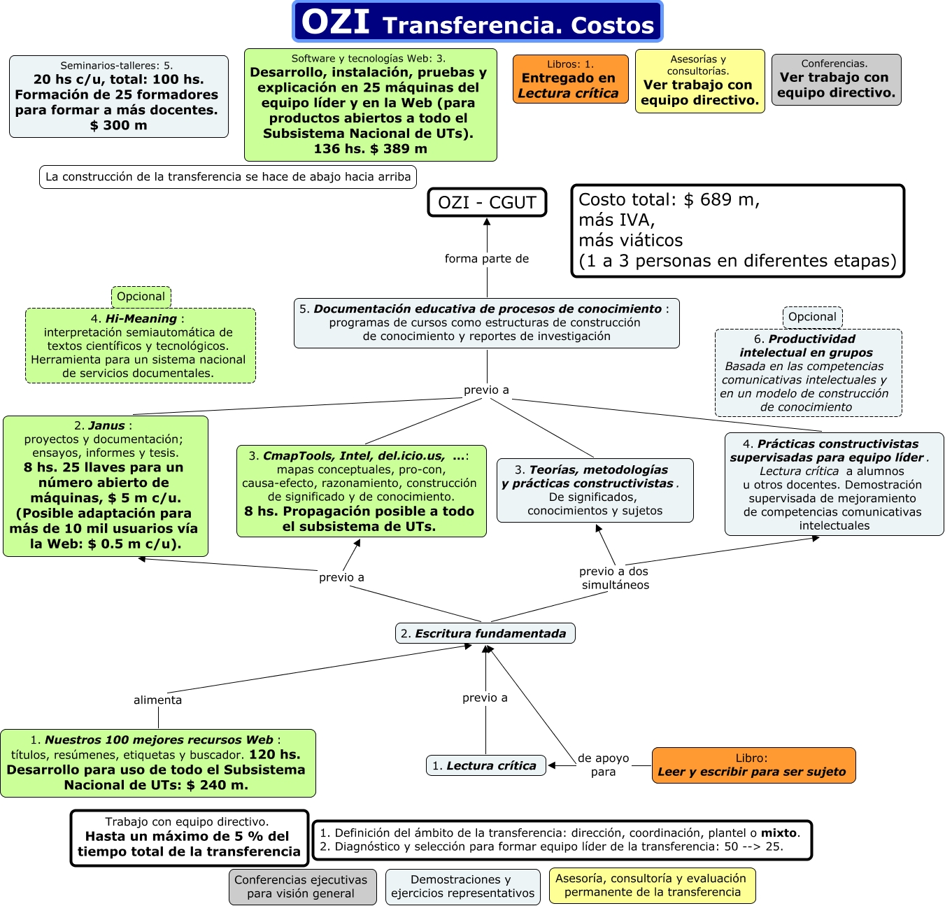 Este mapa conceptual tiene información relacionada a: 5. Esquema-transferencia-CGUT-Tiempos y costos, 4. Prácticas constructivistas supervisadas para equipo líder. Lectura crítica a alumnos u otros docentes. Demostración supervisada de mejoramiento de competencias comunicativas intelectuales previo a 5. Documentación educativa de procesos de conocimiento: programas de cursos como estructuras de construcción de conocimiento y reportes de investigación, 3. CmapTools, Intel, del.icio.us, ...: mapas conceptuales, pro-con, causa-efecto, razonamiento, construcción de significado y de conocimiento. 8 hs. Propagación posible a todo el subsistema de UTs. previo a 5. Documentación educativa de procesos de conocimiento: programas de cursos como estructuras de construcción de conocimiento y reportes de investigación, Libro: Leer y escribir para ser sujeto de apoyo para 2. Escritura fundamentada, 2. Janus: proyectos y documentación; ensayos, informes y tesis. 8 hs. 25 llaves para un número abierto de máquinas, $ 5 m c/u. (Posible adaptación para más de 10 mil usuarios vía la Web: $ 0.5 m c/u). previo a 5. Documentación educativa de procesos de conocimiento: programas de cursos como estructuras de construcción de conocimiento y reportes de investigación, 2. Escritura fundamentada previo a dos simultáneos 3. Teorías, metodologías y prácticas constructivistas. De significados, conocimientos y sujetos, 1. Nuestros 100 mejores recursos Web: títulos, resúmenes, etiquetas y buscador. 120 hs. Desarrollo para uso de todo el Subsistema Nacional de UTs: $ 240 m. alimenta 2. Escritura fundamentada, 5. Documentación educativa de procesos de conocimiento: programas de cursos como estructuras de construcción de conocimiento y reportes de investigación forma parte de OZI - CGUT, 2. Escritura fundamentada previo a dos simultáneos 4. Prácticas constructivistas supervisadas para equipo líder. Lectura crítica a alumnos u otros docentes. Demostración supervisada de mejoramiento de competencias comunicativas intelectuales, 3. Teorías, metodologías y prácticas constructivistas. De significados, conocimientos y sujetos previo a 5. Documentación educativa de procesos de conocimiento: programas de cursos como estructuras de construcción de conocimiento y reportes de investigación, 2. Escritura fundamentada previo a 3. CmapTools, Intel, del.icio.us, ...: mapas conceptuales, pro-con, causa-efecto, razonamiento, construcción de significado y de conocimiento. 8 hs. Propagación posible a todo el subsistema de UTs.
