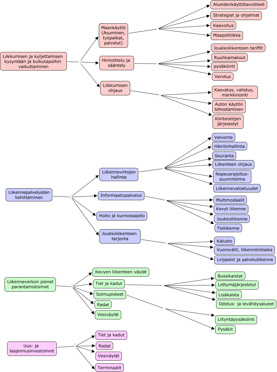 nelipo-malli maankäytönavaus, Hinnoittelu ja sääntely Joukkoliikenteen tariffit, Maankäyttö (Asuminen, työpaikat, palvelut) Maapolitiikka, Informaatiopalvelut Tieliikenne, Maankäyttö (Asuminen, työpaikat, palvelut) Strategiat ja ohjelmat, Liikenneverkon pienet parantamistoimet Kevyen liikenteen väylät, Liikennepalveluiden kehittäminen Joukkoliikenteen tarjonta, Hinnoittelu ja sääntely Verotus, Liikkumisen ohjaus Auton käytön tehostaminen, Liikkumisen ohjaus Kiinteistöjen järjestelyt, Liikennepalveluiden kehittäminen Informaatiopalvelut