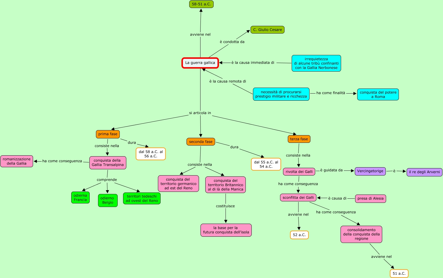 Questa Mappa Concettuale ha informazioni correlate a: ((la guerra gallica.marta)), La guerra gallica si articola in prima fase, seconda fase dura dal 55 a.C. al 54 a.C., La guerra gallica si articola in terza fase, Vercingetorige è il re degli Arverni, prima fase consiste nella conquista della Gallia Transalpina, necessità di procurarsi prestigio militare e ricchezza è la causa remota di La guerra gallica, prima fase dura dal 58 a.C. al 56 a.C., presa di Alesia è causa di sconfitta dei Galli, necessità di procurarsi prestigio militare e ricchezza ha come finalità conquista del potere a Roma, conquista della Gallia Transalpina comprende odierno Belgio