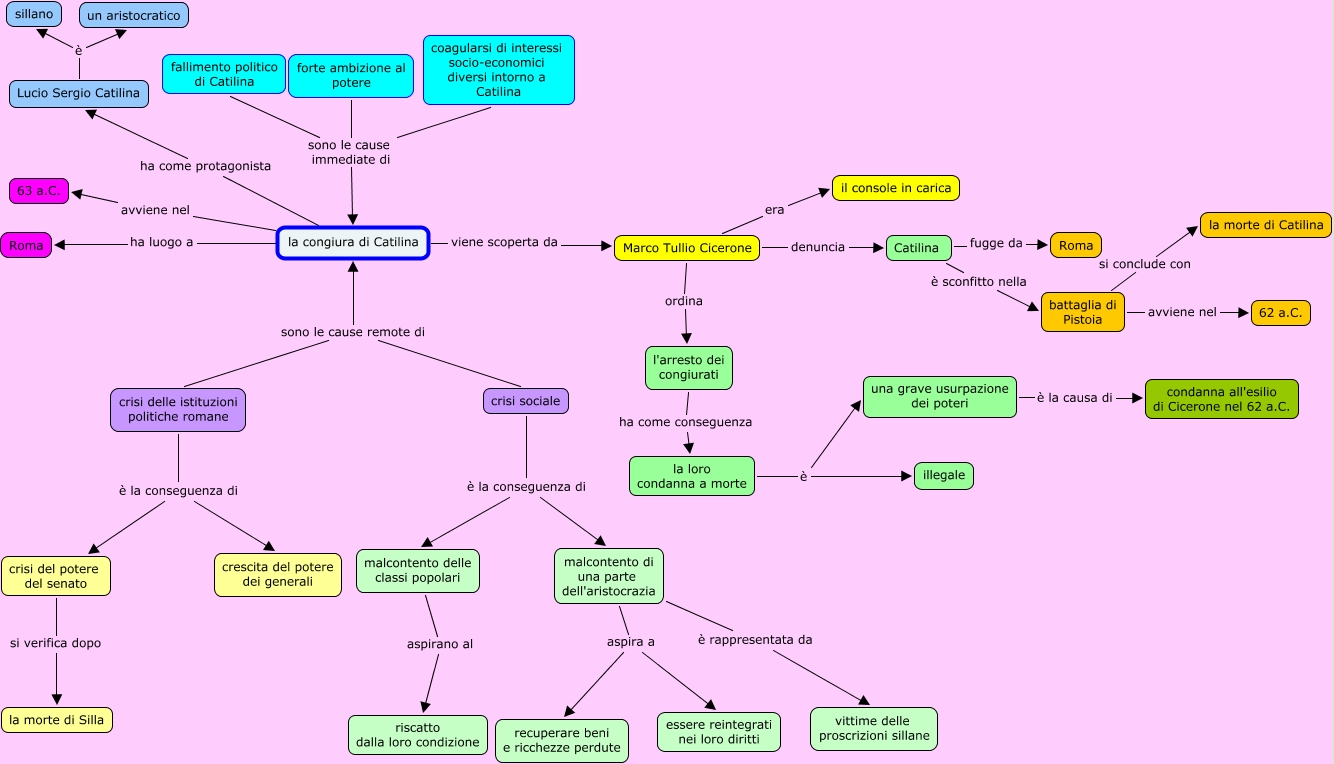 Questa Mappa Concettuale ha informazioni correlate a: ((La congiura di Catilina.marta)), la congiura di Catilina avviene nel 63 a.C., la congiura di Catilina ha luogo a Roma, la loro condanna a morte è illegale, fallimento politico di Catilina sono le cause immediate di la congiura di Catilina, crisi sociale sono le cause remote di la congiura di Catilina, crisi delle istituzioni politiche romane è la conseguenza di crescita del potere dei generali, Marco Tullio Cicerone denuncia Catilina, crisi delle istituzioni politiche romane sono le cause remote di la congiura di Catilina, l'arresto dei congiurati ha come conseguenza la loro condanna a morte, Lucio Sergio Catilina è un aristocratico