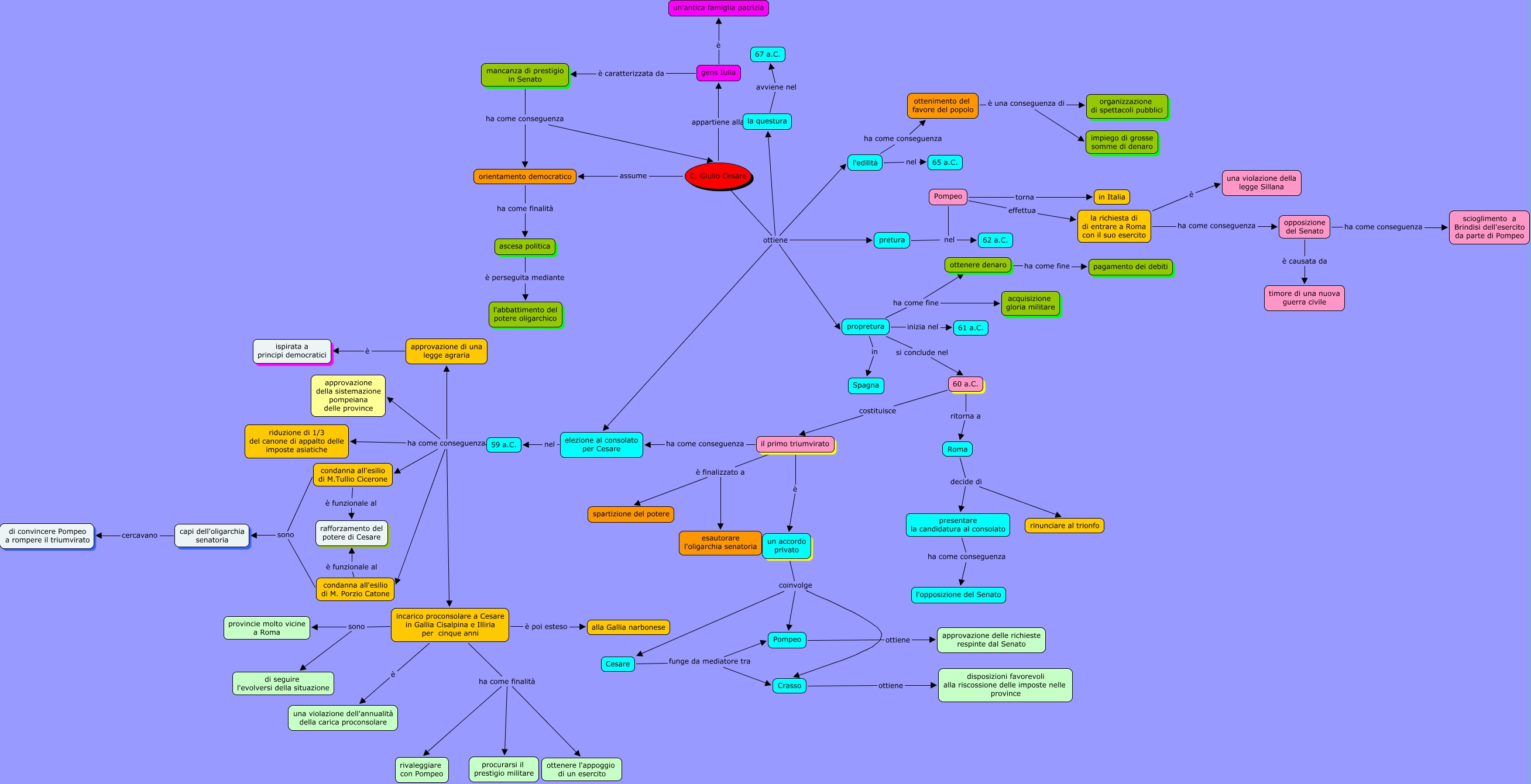 Questa Mappa Concettuale ha informazioni correlate a: ((Ascesa di Cesare.marta)), incarico proconsolare a Cesare in Gallia Cisalpina e Illiria per cinque anni ha come finalità procurarsi il prestigio militare, un accordo privato coinvolge Pompeo, Pompeo torna in Italia, 59 a.C. ha come conseguenza incarico proconsolare a Cesare in Gallia Cisalpina e Illiria per cinque anni, il primo triumvirato ha come conseguenza elezione al consolato per Cesare, incarico proconsolare a Cesare in Gallia Cisalpina e Illiria per cinque anni ha come finalità rivaleggiare con Pompeo, C. Giulio Cesare ottiene la questura, ascesa politica è perseguita mediante l'abbattimento del potere oligarchico, la questura avviene nel 67 a.C., incarico proconsolare a Cesare in Gallia Cisalpina e Illiria per cinque anni sono provincie molto vicine a Roma