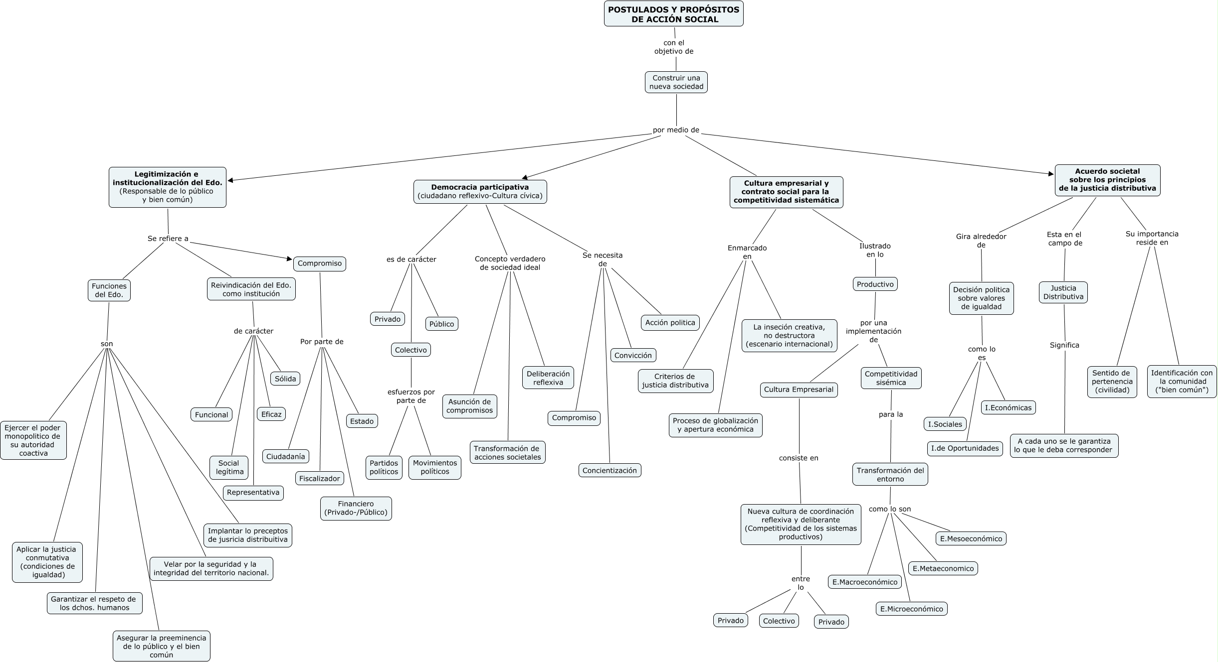 Este mapa conceptual tiene información relacionada a: AXIO PROPOSITOS, Colectivo esfuerzos por parte de Movimientos políticos, Cultura Empresarial consiste en Nueva cultura de coordinación reflexiva y deliberante (Competitividad de los sistemas productivos), Transformación del entorno como lo son E.Macroeconómico, Democracia participativa (ciudadano reflexivo-Cultura cívica) Se necesita de Convicción, Cultura empresarial y contrato social para la competitividad sistemática Enmarcado en Proceso de globalización y apertura económica, Competitividad sisémica para la Transformación del entorno, Legitimización e institucionalización del Edo. (Responsable de lo público y bien común) Se refiere a Funciones del Edo., Democracia participativa (ciudadano reflexivo-Cultura cívica) es de carácter Público, Justicia Distributiva Significa A cada uno se le garantiza lo que le deba corresponder, Cultura empresarial y contrato social para la competitividad sistemática Enmarcado en La inseción creativa, no destructora (escenario internacional), Reivindicación del Edo. como institución de carácter Sólida, Compromiso Por parte de Fiscalizador, Transformación del entorno como lo son E.Microeconómico, Democracia participativa (ciudadano reflexivo-Cultura cívica) Concepto verdadero de sociedad ideal Deliberación reflexiva, Acuerdo societal sobre los principios de la justicia distributiva Esta en el campo de Justicia Distributiva, Acuerdo societal sobre los principios de la justicia distributiva Su importancia reside en Sentido de pertenencia (civilidad), Funciones del Edo. son Implantar lo preceptos de jusricia distribuitiva, Transformación del entorno como lo son E.Mesoeconómico, Compromiso Por parte de Ciudadanía, Reivindicación del Edo. como institución de carácter Social legítima