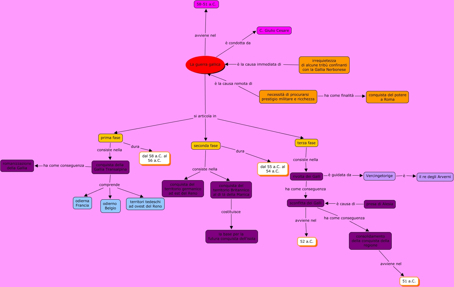 Questa Mappa Concettuale ha informazioni correlate a: -lla guerra gallica brenda-, La guerra gallica si articola in prima fase, seconda fase dura dal 55 a.C. al 54 a.C., La guerra gallica si articola in terza fase, presa di Alesia è causa di sconfitta dei Galli, prima fase dura dal 58 a.C. al 56 a.C., necessità di procurarsi prestigio militare e ricchezza è la causa remota di La guerra gallica, prima fase consiste nella conquista della Gallia Transalpina, Vercingetorige è il re degli Arverni, necessità di procurarsi prestigio militare e ricchezza ha come finalità conquista del potere a Roma, conquista della Gallia Transalpina comprende odierno Belgio