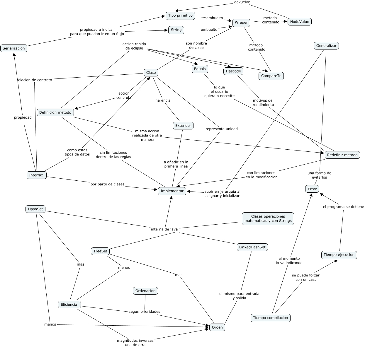 Este mapa conceptual tiene información relacionada a: java, TreeSet menos Eficiencia, Clase herencia Extender, String embuelto Wraper, Equals lo que el usuario quiera o necesite Redefinir metodo, Hascode motivos de rendimiento Redefinir metodo, Tiempo compilacion al momento lo va indicando Error, Serializacion propiedad a indicar para que puedan ir en un flujo String, Eficiencia segun prioridades Orden, Tiempo compilacion se puede forzar con un cast Tiempo ejecucion, LinkedHashSet interna de java Implementar