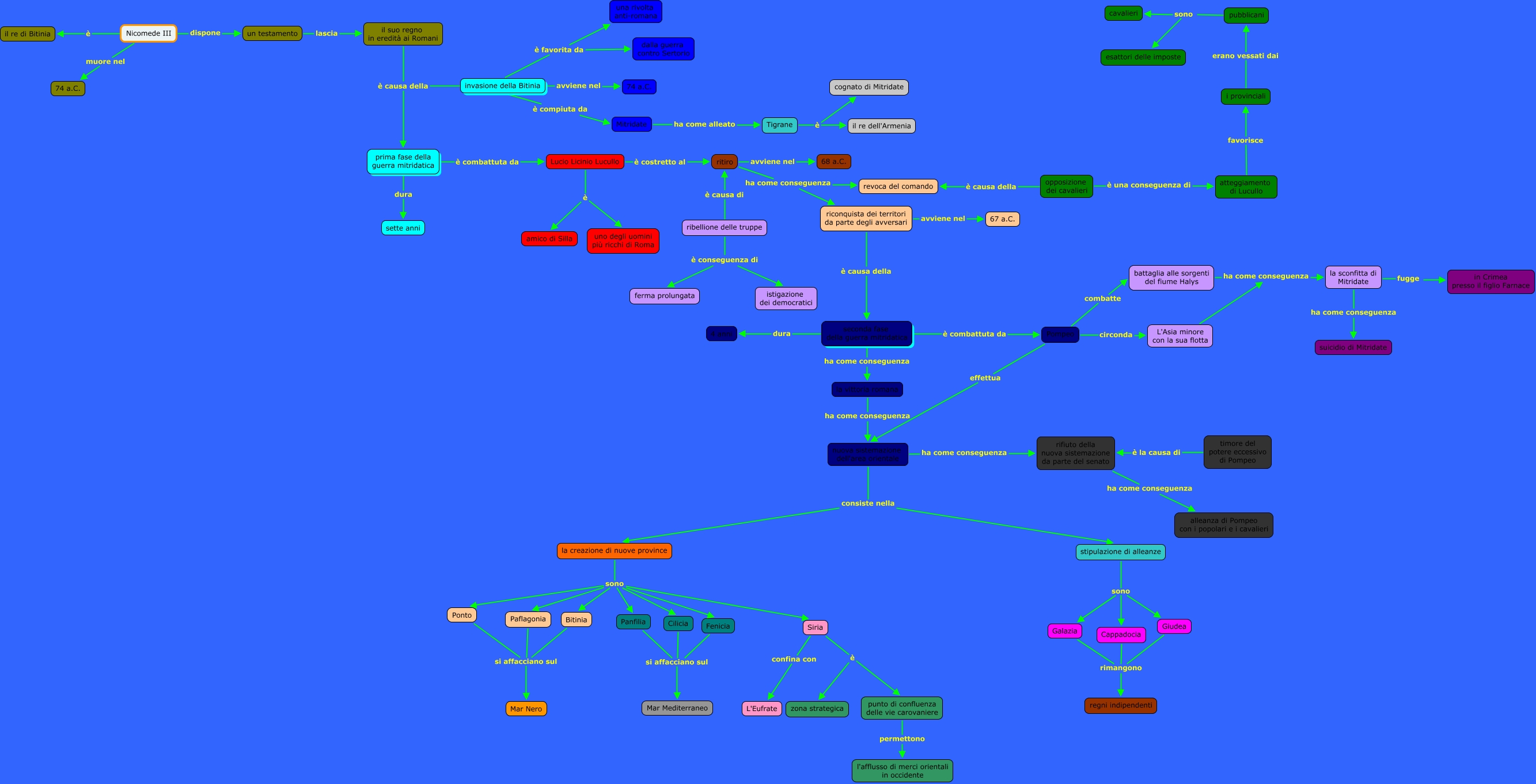 Questa Mappa Concettuale ha informazioni correlate a: Guerra mitridatica.Riccardo Olivieri, Siria è punto di confluenza delle vie carovaniere, seconda fase della guerra mitridatica dura 4 anni, invasione della Bitinia è favorita da una rivolta anti-romana, Paflagonia si affacciano sul Mar Nero, la creazione di nuove province sono Bitinia, Pompeo circonda L'Asia minore con la sua flotta, la sconfitta di Mitridate ha come conseguenza suicidio di Mitridate, pubblicani sono cavalieri, stipulazione di alleanze sono Galazia, battaglia alle sorgenti del fiume Halys ha come conseguenza la sconfitta di Mitridate