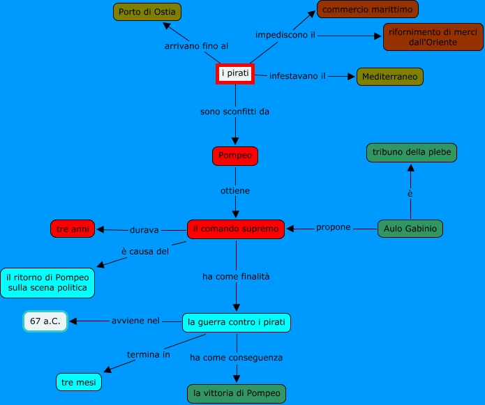 Questa Mappa Concettuale ha informazioni correlate a: Guerra contro i pirati.Riccardo Olivieri, il comando supremo durava tre anni, il comando supremo ha come finalità la guerra contro i pirati, i pirati impediscono il rifornimento di merci dall'Oriente, la guerra contro i pirati ha come conseguenza la vittoria di Pompeo, il comando supremo è causa del il ritorno di Pompeo sulla scena politica, la guerra contro i pirati avviene nel 67 a.C., i pirati infestavano il Mediterraneo, i pirati sono sconfitti da Pompeo, Pompeo ottiene il comando supremo, la guerra contro i pirati termina in tre mesi