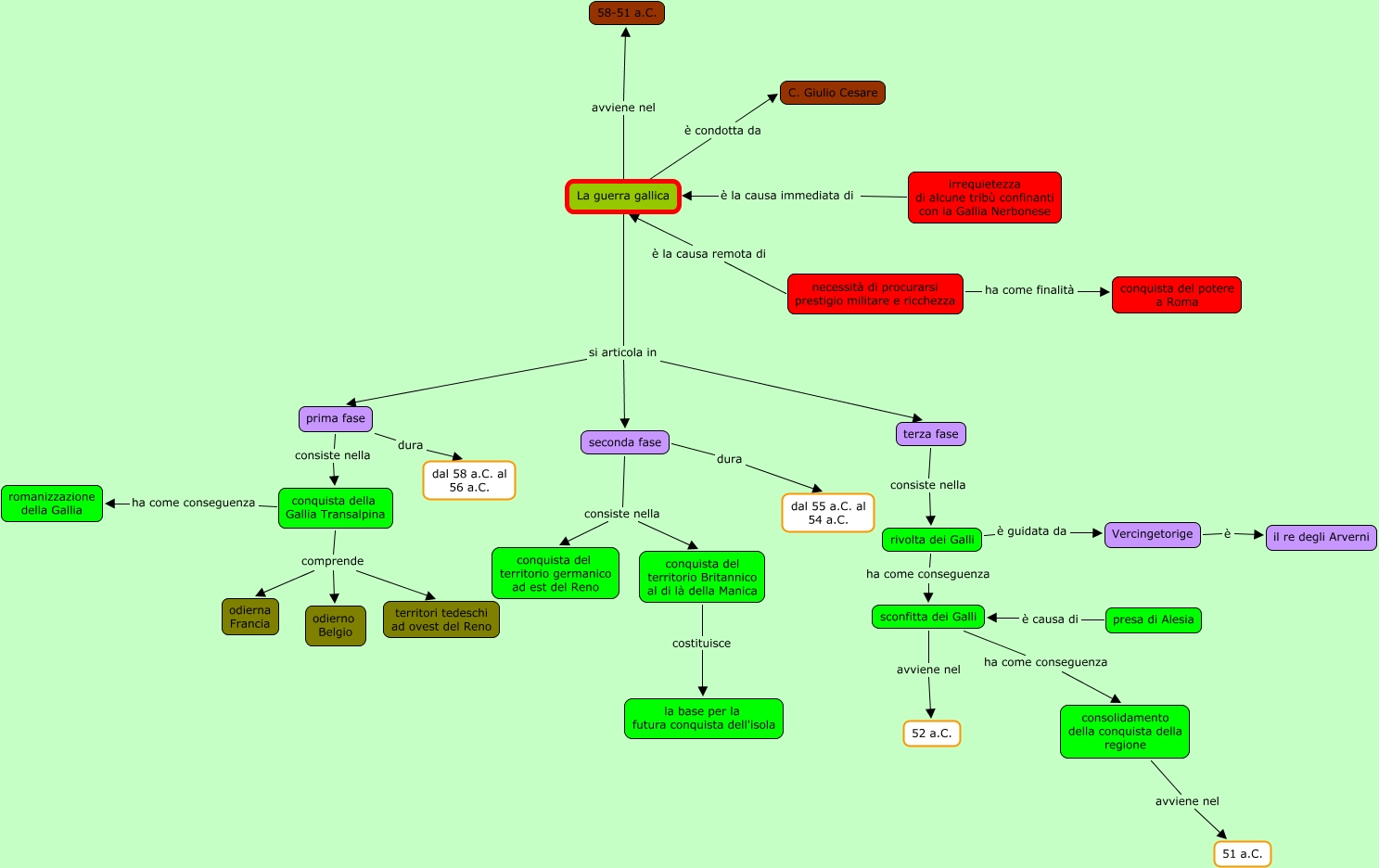 Questa Mappa Concettuale ha informazioni correlate a: la guerra gallica.Riccardo Olivieri, La guerra gallica si articola in prima fase, seconda fase dura dal 55 a.C. al 54 a.C., La guerra gallica si articola in terza fase, presa di Alesia è causa di sconfitta dei Galli, prima fase dura dal 58 a.C. al 56 a.C., necessità di procurarsi prestigio militare e ricchezza è la causa remota di La guerra gallica, prima fase consiste nella conquista della Gallia Transalpina, Vercingetorige è il re degli Arverni, necessità di procurarsi prestigio militare e ricchezza ha come finalità conquista del potere a Roma, conquista della Gallia Transalpina comprende odierno Belgio