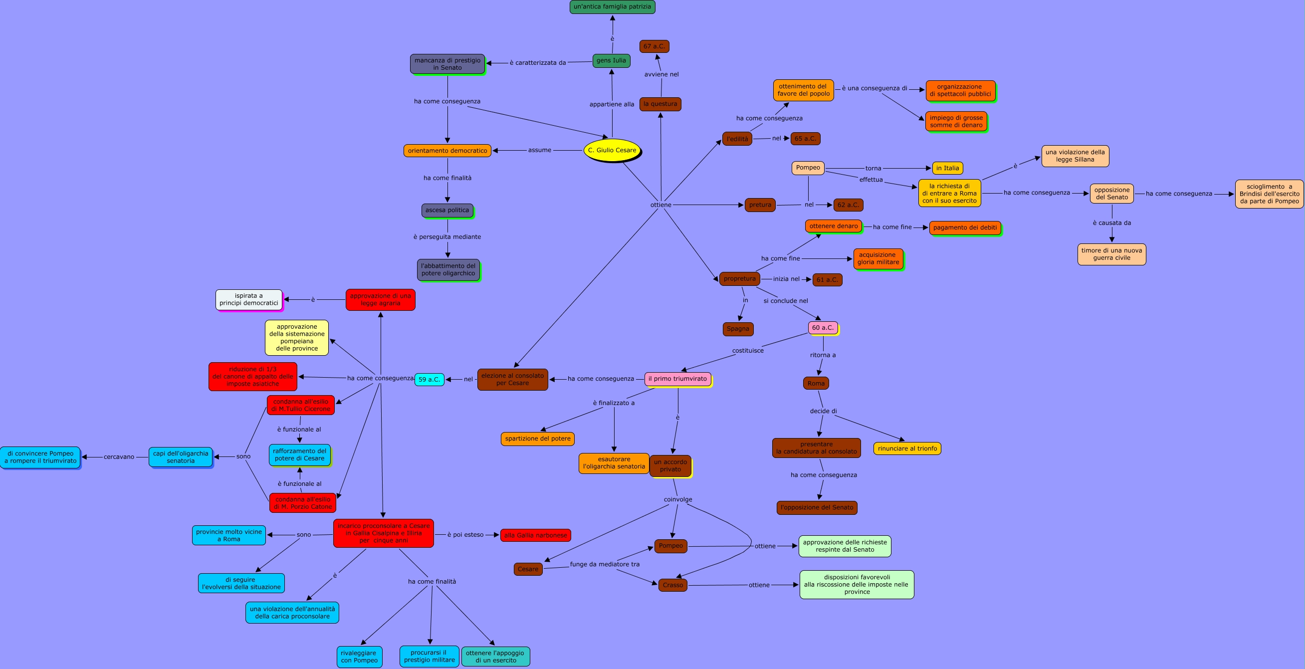 Questa Mappa Concettuale ha informazioni correlate a: Ascesa di Cesare.Riccardo Olivieri, Pompeo torna in Italia, un accordo privato coinvolge Pompeo, incarico proconsolare a Cesare in Gallia Cisalpina e Illiria per cinque anni ha come finalità procurarsi il prestigio militare, il primo triumvirato ha come conseguenza elezione al consolato per Cesare, 59 a.C. ha come conseguenza incarico proconsolare a Cesare in Gallia Cisalpina e Illiria per cinque anni, ascesa politica è perseguita mediante l'abbattimento del potere oligarchico, C. Giulio Cesare ottiene la questura, incarico proconsolare a Cesare in Gallia Cisalpina e Illiria per cinque anni ha come finalità rivaleggiare con Pompeo, la questura avviene nel 67 a.C., C. Giulio Cesare appartiene alla gens Iulia