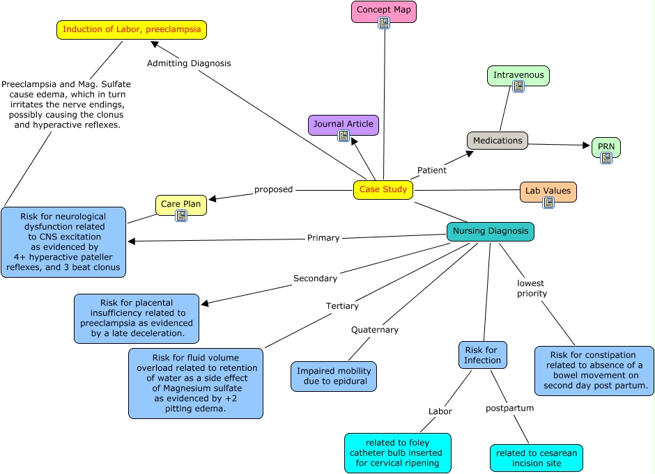 This Concept Map has information related to: CASE STUDY Angela, Case Study Patient Medications, Risk for neurological dysfunction related to CNS excitation as evidenced by 4+ hyperactive pateller reflexes, and 3 beat clonus ???? Care Plan, Case Study proposed Care Plan, Nursing Diagnosis Tertiary Risk for fluid volume overload related to retention of water as a side effect of Magnesium sulfate as evidenced by +2 pitting edema., Case Study ???? Nursing Diagnosis, Case Study ???? Concept Map, Medications ???? Intravenous, Case Study Admitting Diagnosis Induction of Labor, preeclampsia, Nursing Diagnosis ???? Risk for Infection, Induction of Labor, preeclampsia Preeclampsia and Mag. Sulfate cause edema, which in turn irritates the nerve endings, possibly causing the clonus and hyperactive reflexes. Risk for neurological dysfunction related to CNS excitation as evidenced by 4+ hyperactive pateller reflexes, and 3 beat clonus