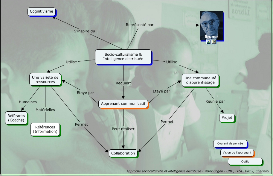 This Concept Map has information related to: Socioculturalisme-Peter, Une communauté d'apprentissage Permet Collaboration, Apprenant communicatif Etayé par Une communauté d'apprentissage, Socio-culturalisme & Intelligence distribuée Requiert Apprenant communicatif, Socio-culturalisme & Intelligence distribuée Utilise Une variété de ressources, Socio-culturalisme & Intelligence distribuée Représenté par Bruner, Une variété de ressources Humaines Référants (Coachs), Une communauté d'apprentissage Réunie par Projet, Socio-culturalisme & Intelligence distribuée Utilise Une communauté d'apprentissage, Une variété de ressources Matérielles Références (Information), Une variété de ressources Permet Collaboration