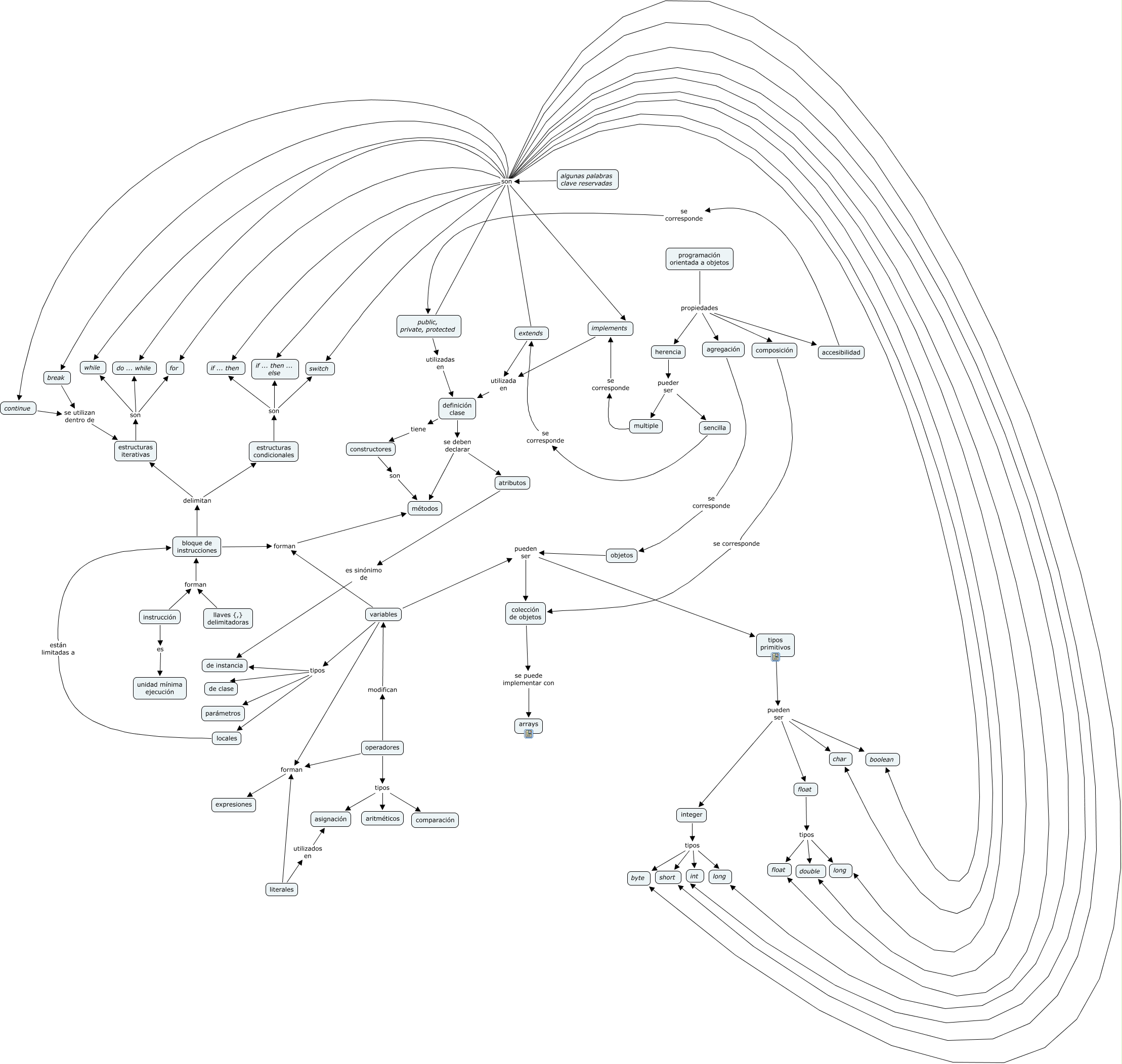 Este mapa conceptual tiene información relacionada a: sintaxis-java-1, bloque de instrucciones delimitan estructuras condicionales, algunas palabras clave reservadas son extends, algunas palabras clave reservadas son do ... while, literales utilizados en asignación, herencia pueder ser sencilla, variables pueden ser tipos primitivos, algunas palabras clave reservadas son for, algunas palabras clave reservadas son switch, integer tipos short, programación orientada a objetos propiedades composición