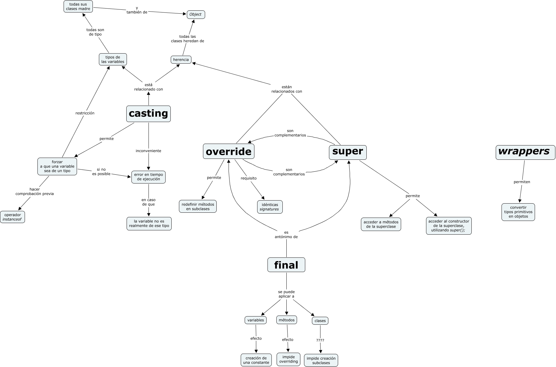 Este mapa conceptual tiene información relacionada a: sintaxis-java-2, final se puede aplicar a clases, casting inconveniente error en tiempo de ejecución, final se puede aplicar a variables, wrappers permiten convertir tipos primitivos en objetos, métodos efecto impide overriding, casting permite forzar a que una variable sea de un tipo, error en tiempo de ejecución en caso de que la variable no es realmente de ese tipo, super permite acceder al constructor de la superclase, utilizando super();, todas sus clases madre y también de Object, forzar a que una variable sea de un tipo restricción tipos de las variables