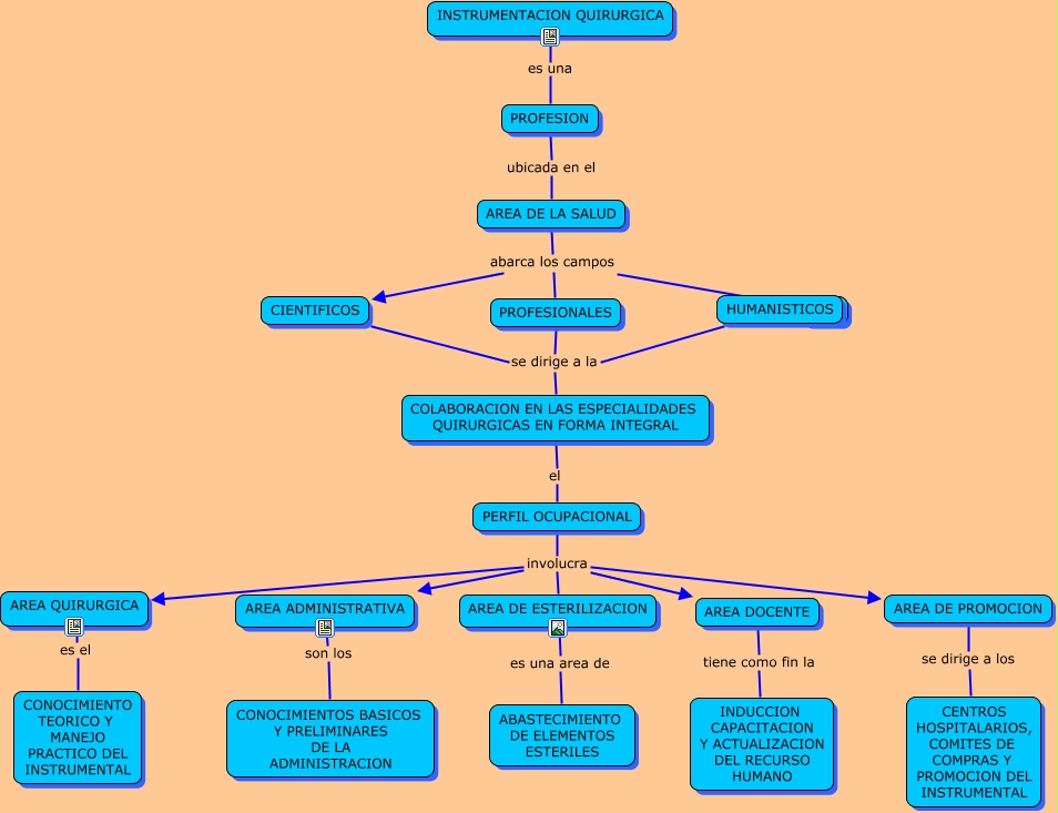Este Cmap, tiene información relacionada con: instrumenatcion quirurgica, AREA DE PROMOCION se dirige a los CENTROS HOSPITALARIOS, COMITES DE COMPRAS Y PROMOCION DEL INSTRUMENTAL, AREA QUIRURGICA es el CONOCIMIENTO TEORICO Y MANEJO PRACTICO DEL INSTRUMENTAL, AREA DOCENTE tiene como fin la INDUCCION CAPACITACION Y ACTUALIZACION DEL RECURSO HUMANO, AREA ADMINISTRATIVA son los CONOCIMIENTOS BASICOS Y PRELIMINARES DE LA ADMINISTRACION, AREA DE LA SALUD abarca los campos ????, PERFIL OCUPACIONAL involucra AREA ADMINISTRATIVA, HUMANISTICOS se dirige a la COLABORACION EN LAS ESPECIALIDADES QUIRURGICAS EN FORMA INTEGRAL, PERFIL OCUPACIONAL involucra AREA DE PROMOCION, PERFIL OCUPACIONAL involucra AREA DE ESTERILIZACION, AREA DE LA SALUD abarca los campos CIENTIFICOS, AREA DE ESTERILIZACION es una area de ABASTECIMIENTO DE ELEMENTOS ESTERILES, COLABORACION EN LAS ESPECIALIDADES QUIRURGICAS EN FORMA INTEGRAL el PERFIL OCUPACIONAL, PROFESIONALES se dirige a la COLABORACION EN LAS ESPECIALIDADES QUIRURGICAS EN FORMA INTEGRAL, AREA DE LA SALUD abarca los campos PROFESIONALES, PROFESION ubicada en el AREA DE LA SALUD, CIENTIFICOS se dirige a la COLABORACION EN LAS ESPECIALIDADES QUIRURGICAS EN FORMA INTEGRAL, PERFIL OCUPACIONAL involucra AREA DOCENTE, PERFIL OCUPACIONAL involucra AREA QUIRURGICA