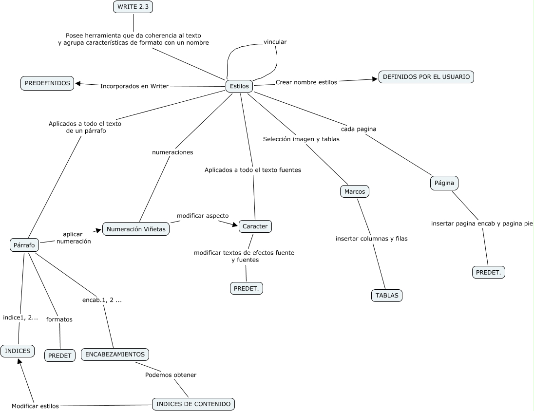 Este mapa conceptual tiene información relacionada a: monica_estilos, Estilos Selección imagen y tablas Marcos, ENCABEZAMIENTOS Podemos obtener INDICES DE CONTENIDO, Marcos insertar columnas y filas TABLAS, Estilos Crear nombre estilos DEFINIDOS POR EL USUARIO, Estilos Aplicados a todo el texto de un párrafo Párrafo, Estilos cada pagina Página, Caracter modificar textos de efectos fuente y fuentes PREDET., Estilos numeraciones Numeración Viñetas, INDICES DE CONTENIDO Modificar estilos INDICES, Párrafo indice1, 2... INDICES