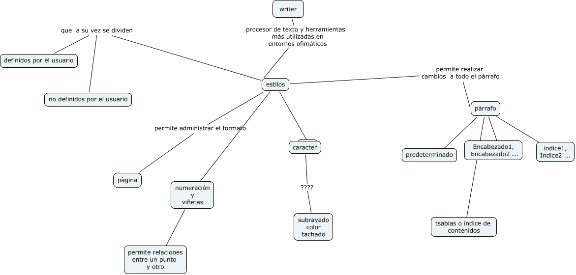 Este mapa conceptual tiene información relacionada a: writer_carmen, caracter ???? subrayado color tachado, ???? ???? indice1, Indice2 ..., estilos ???? caracter, estilos ???? numeraciòn y viñetas, pàrrafo ???? predeterminado, pàrrafo ???? Encabezado1, Encabezado2 ..., estilos que a su vez se dividen no definidos por el usuario, estilos permite realizar cambios a todo el pàrrafo pàrrafo, pàrrafo ???? tsablas o indice de contenidos, writer procesor de texto y herramientas màs utilizadas en entornos ofimàticos estilos