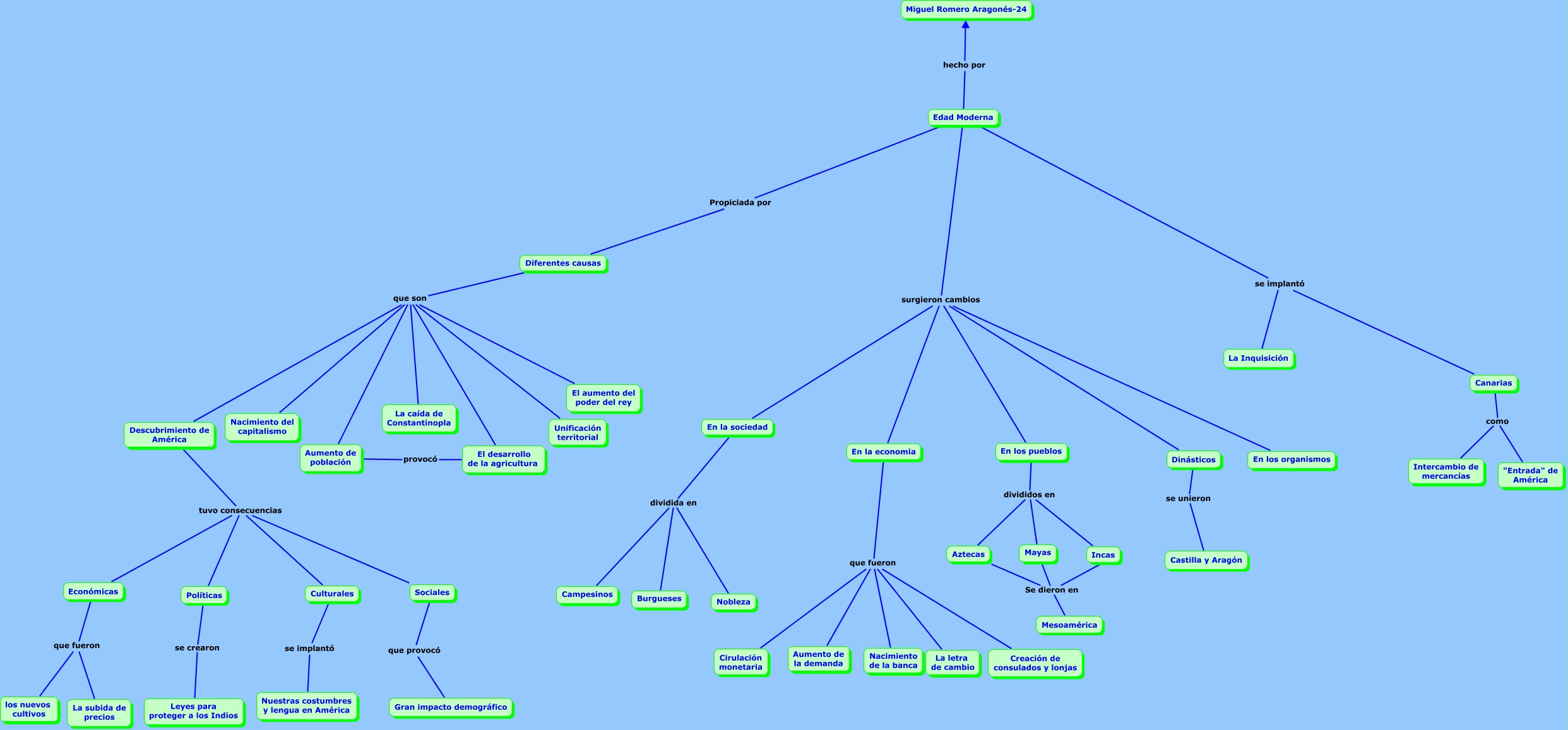 Este mapa conceptual tiene información relacionada a: 24-Miguel Romero Aragonés-edad media, Dinásticos se unieron Castilla y Aragón, Edad Moderna Propiciada por Diferentes causas, Diferentes causas que son El aumento del poder del rey, Edad Moderna se implantó La Inquisición, En los pueblos divididos en Aztecas, En la economia que fueron Creación de consulados y lonjas, Diferentes causas que son Unificación territorial, En los pueblos divididos en Mayas, En la economia que fueron Cirulación monetaria, Edad Moderna surgieron cambios En la sociedad