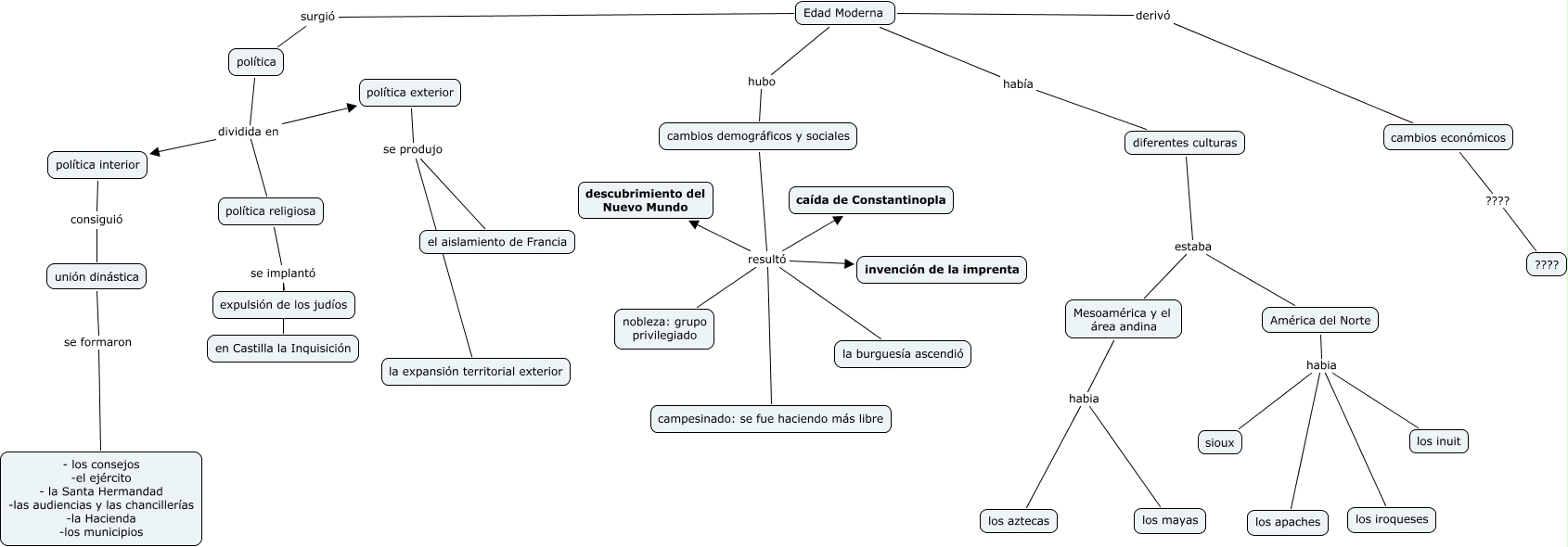 Este mapa conceptual tiene información relacionada a: 14-Marina Jiménez Pérez-Edad Moderna, cambios demográficos y sociales resultó invención de la imprenta, política religiosa se implantó expulsión de los judíos, diferentes culturas estaba Mesoamérica y el área andina, América del Norte habia los apaches, política dividida en política religiosa, política exterior se produjo la expansión territorial exterior, política religiosa se implantó en Castilla la Inquisición, cambios demográficos y sociales resultó nobleza: grupo privilegiado, cambios demográficos y sociales resultó descubrimiento del Nuevo Mundo, América del Norte habia los iroqueses