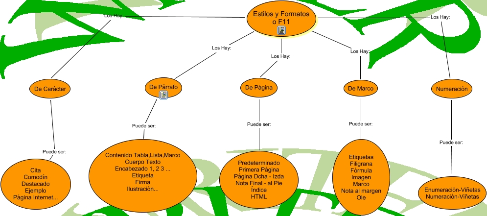 Este mapa conceptual tiene información relacionada a: Estilos_Estrella, De Párrafo Puede ser: Contenido Tabla,Lista,Marco Cuerpo Texto Encabezado 1, 2 3 ... Etiqueta Firma Ilustración..., Estilos y Formatos o F11 Los Hay: De Marco, Estilos y Formatos o F11 Los Hay: De Página, Numeración Puede ser: Enumeración-Viñetas Numeración-Viñetas, De Página Puede ser: Predeterminado Primera Página Página Dcha - Izda Nota Final - al Pie Índice HTML, Estilos y Formatos o F11 Los Hay: De Párrafo, De Marco Puede ser: Etiquetas Filigrana Fórmula Imagen Marco Nota al margen Ole, De Carácter Puede ser: Cita Comodín Destacado Ejemplo Página Internet..., Estilos y Formatos o F11 Los Hay: Numeración, Estilos y Formatos o F11 Los Hay: De Carácter