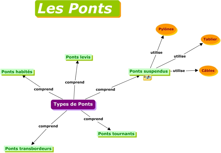 This Concept Map has information related to: Les Ponts, Ponts suspendus utilise Tablier, Types de Ponts comprend Ponts transbordeurs, Types de Ponts comprend Ponts tournants, Ponts suspendus utilise Câbles, Types de Ponts comprend Ponts habités, Ponts suspendus utilise Pylônes, Types de Ponts comprend Ponts levis, Types de Ponts comprend Ponts suspendus