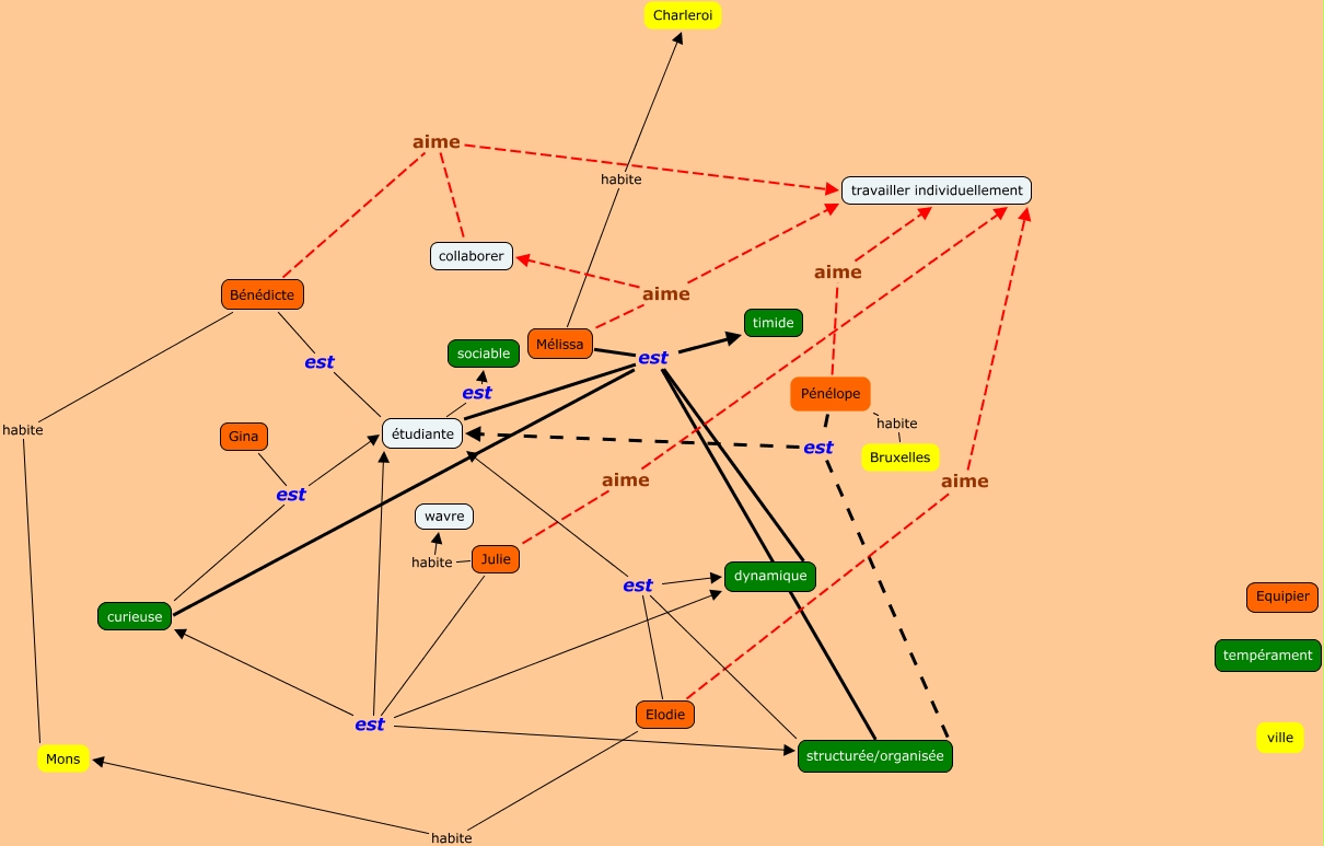 This Concept Map, created with IHMC CmapTools, has information related to: Profils équipe N_2, Elodie habite Mons, Bénédicte est étudiante, Bénédicte aime collaborer, Julie aime travailler individuellement, Mélissa est curieuse, Julie habite wavre, étudiante est sociable, Elodie est dynamique, Bénédicte habite Mons, Julie est curieuse, Julie est étudiante, Mélissa habite Charleroi, Julie est structurée/organisée, Pénélope est étudiante, Bénédicte aime travailler individuellement, Pénélope aime travailler individuellement, Mélissa est étudiante, Gina est étudiante, Mélissa aime travailler individuellement, Elodie est structurée/organisée