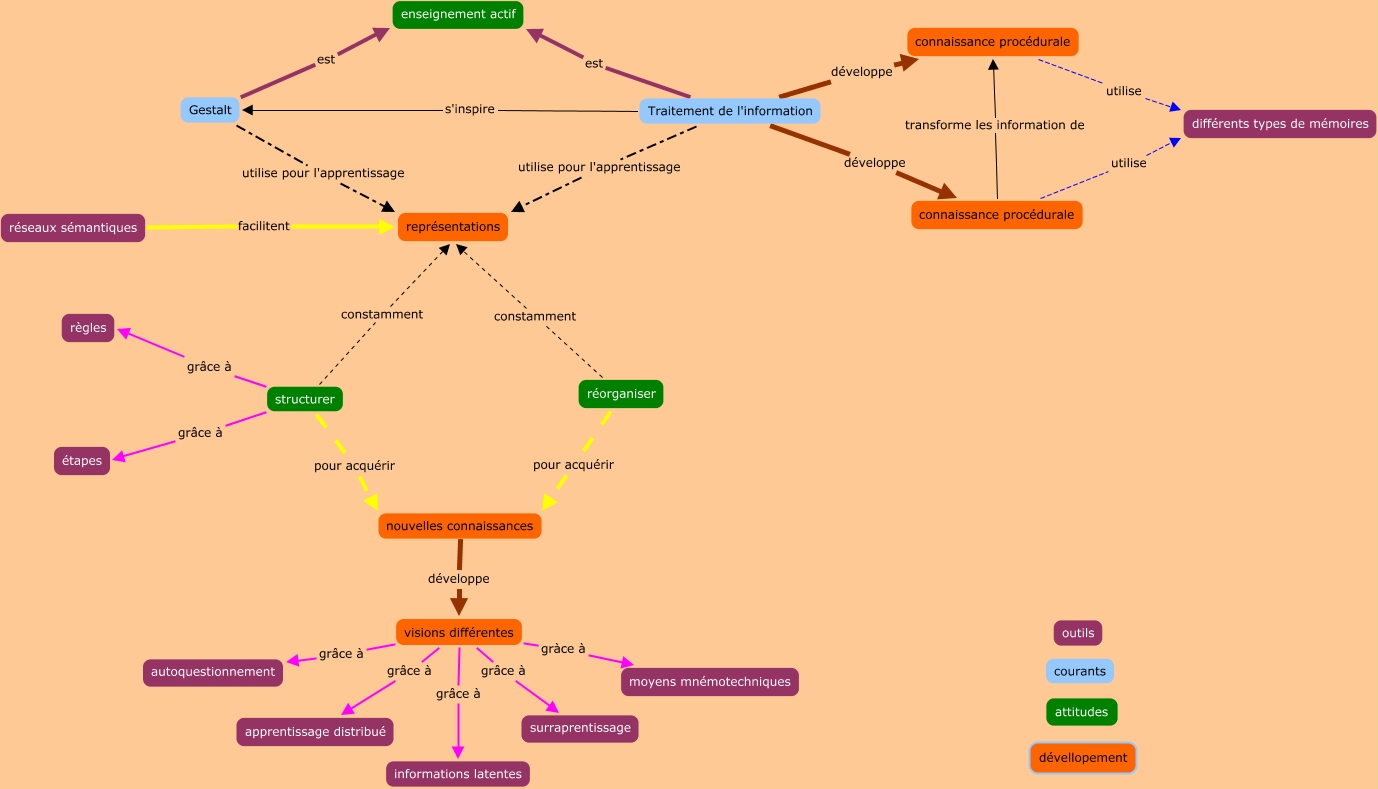 This Concept Map, created with IHMC CmapTools, has information related to: Gestalt et traitement de l'info, connaissance procédurale utilise différents types de mémoires, connaissance procédurale transforme les information de connaissance procédurale, Traitement de l'information développe connaissance procédurale, Traitement de l'information développe connaissance procédurale, visions différentes gràce à moyens mnémotechniques, structurer grâce à étapes, connaissance procédurale utilise différents types de mémoires, réseaux sémantiques facilitent représentations, visions différentes grâce à surraprentissage, visions différentes grâce à apprentissage distribué, structurer constamment représentations, réorganiser constamment représentations, Gestalt est enseignement actif, structurer pour acquérir nouvelles connaissances, réorganiser pour acquérir nouvelles connaissances, visions différentes grâce à informations latentes, structurer grâce à règles, Traitement de l'information est enseignement actif, Traitement de l'information utilise pour l'apprentissage représentations, Gestalt utilise pour l'apprentissage représentations