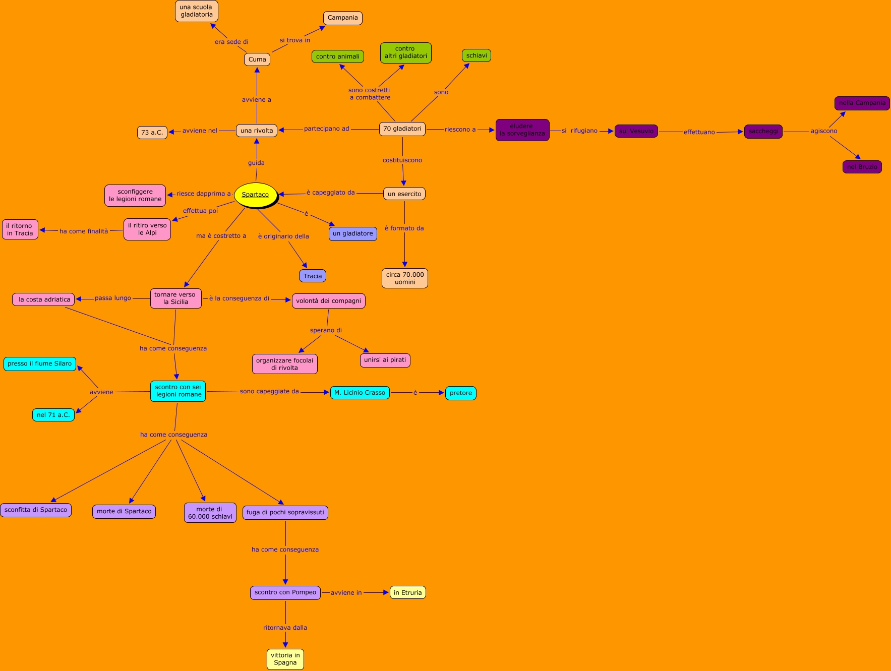 Questa Mappa Concettuale ha informazioni correlate a: Spartaco.....Lara Ceccarelli 2E, Spartaco è un gladiatore, Spartaco è originario della Tracia, volontà dei compagni sperano di unirsi ai pirati, scontro con sei legioni romane ha come conseguenza morte di Spartaco, un esercito è formato da circa 70.000 uomini, scontro con Pompeo ritornava dalla vittoria in Spagna, tornare verso la Sicilia ha come conseguenza scontro con sei legioni romane, eludere la sorveglianza si rifugiano sul Vesuvio, 70 gladiatori riescono a eludere la sorveglianza, un esercito è capeggiato da Spartaco