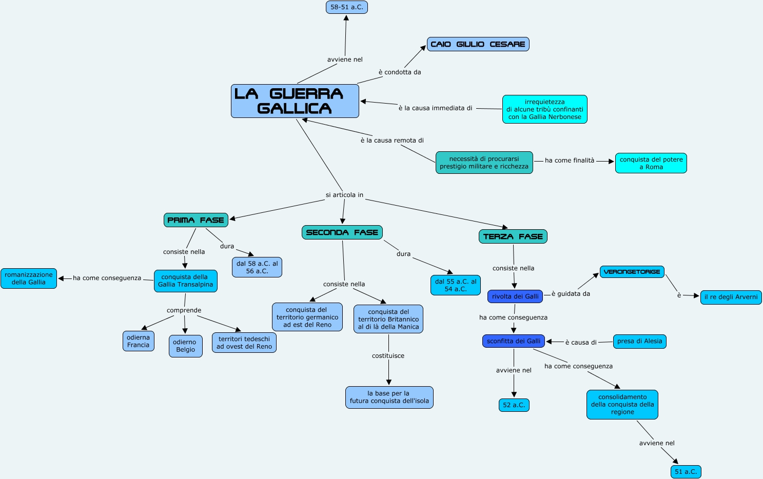 Questa Mappa Concettuale ha informazioni correlate a: La guerra gallica JAMES, VERCINGETORIGE è il re degli Arverni, rivolta dei Galli è guidata da VERCINGETORIGE, LA GUERRA GALLICA si articola in TERZA FASE, presa di Alesia è causa di sconfitta dei Galli, necessità di procurarsi prestigio militare e ricchezza ha come finalità conquista del potere a Roma, conquista della Gallia Transalpina comprende odierno Belgio, SECONDA FASE consiste nella conquista del territorio Britannico al di là della Manica, consolidamento della conquista della regione avviene nel 51 a.C., necessità di procurarsi prestigio militare e ricchezza è la causa remota di LA GUERRA GALLICA, SECONDA FASE dura dal 55 a.C. al 54 a.C.