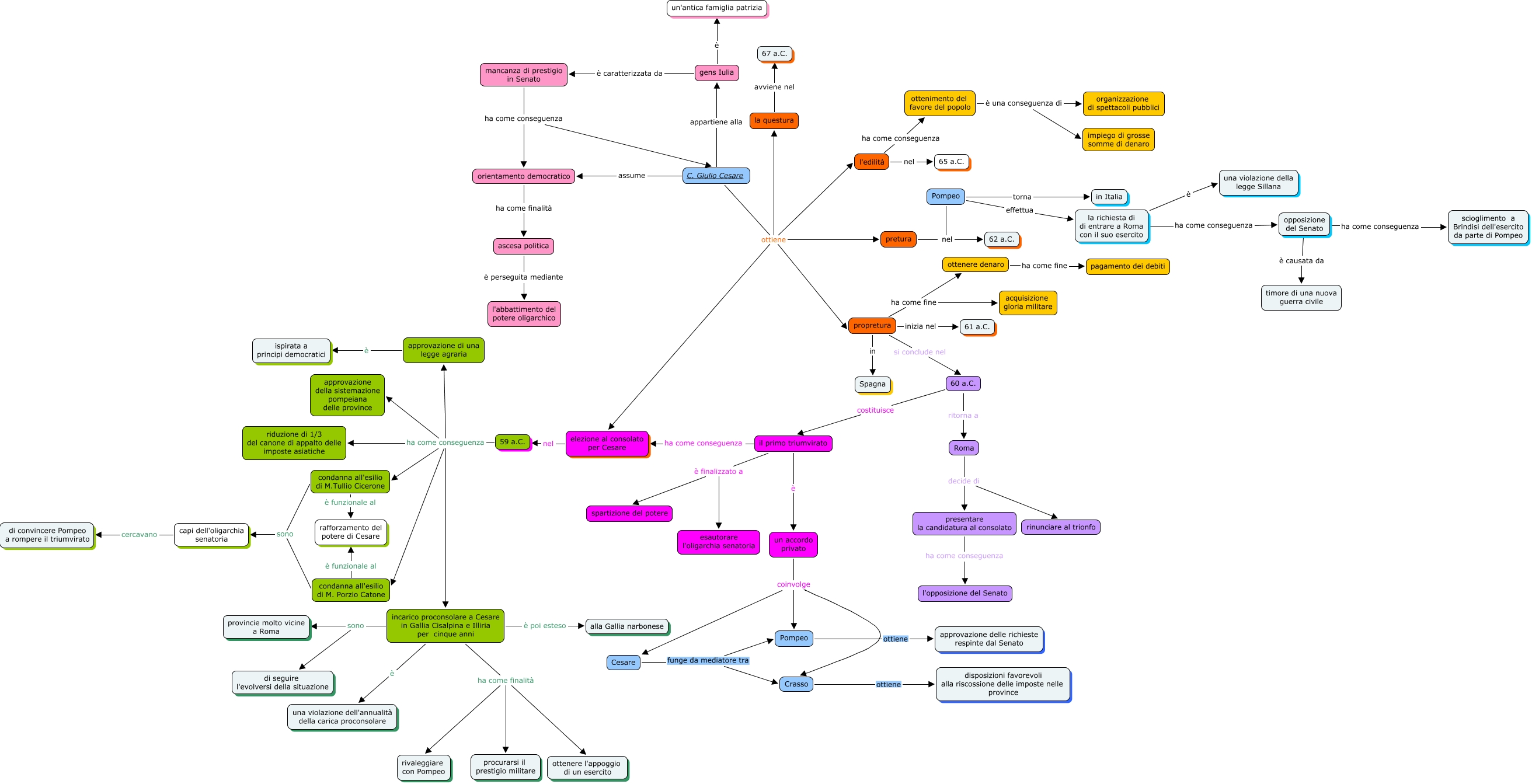 Questa Mappa Concettuale ha informazioni correlate a: storia gabry e vivi, Pompeo torna in Italia, un accordo privato coinvolge Pompeo, incarico proconsolare a Cesare in Gallia Cisalpina e Illiria per cinque anni ha come finalità procurarsi il prestigio militare, il primo triumvirato ha come conseguenza elezione al consolato per Cesare, 59 a.C. ha come conseguenza incarico proconsolare a Cesare in Gallia Cisalpina e Illiria per cinque anni, ascesa politica è perseguita mediante l'abbattimento del potere oligarchico, C. Giulio Cesare ottiene la questura, incarico proconsolare a Cesare in Gallia Cisalpina e Illiria per cinque anni ha come finalità rivaleggiare con Pompeo, la questura avviene nel 67 a.C., C. Giulio Cesare appartiene alla gens Iulia