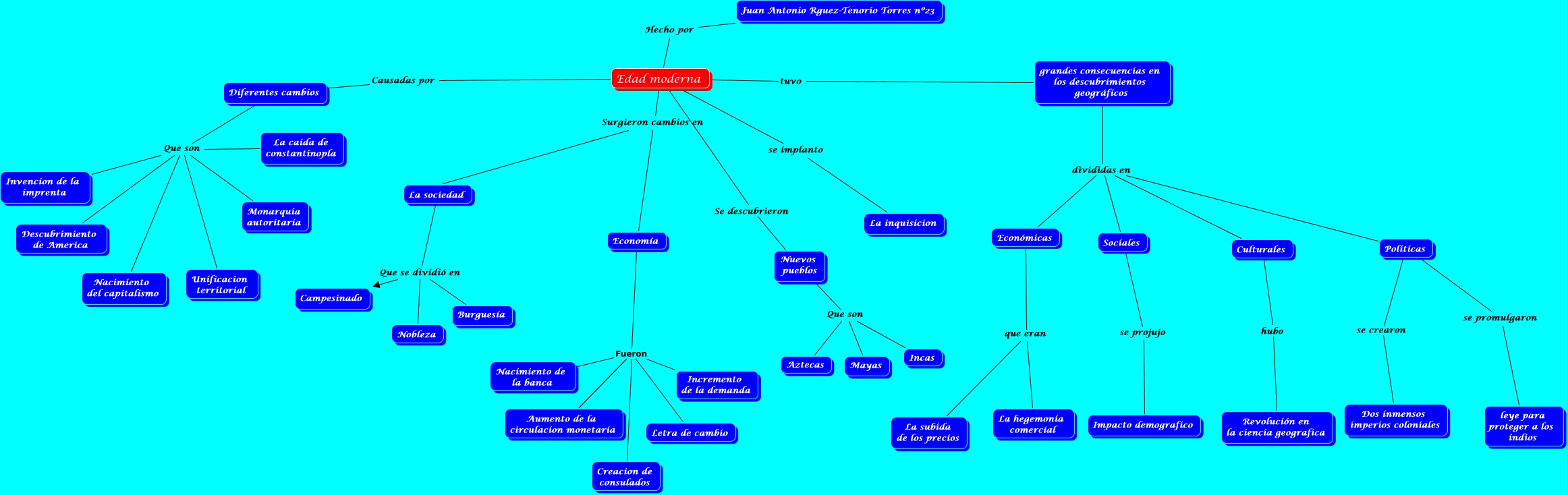 Este mapa conceptual tiene información relacionada a: 23-J.Antonio Rguez-Tenorio Torres-la edad moderna, Edad moderna se implanto La inquisicion, Juan Antonio Rguez-Tenorio Torres nº23 Hecho por Edad moderna, Politicas se promulgaron leye para proteger a los indios, Diferentes cambios Que son Unificacion territorial, La sociedad Que se dividió en Burguesía, grandes consecuencias en los descubrimientos geográficos divididas en Culturales, Economía Fueron Incremento de la demanda, Edad moderna Surgieron cambios en La sociedad, grandes consecuencias en los descubrimientos geográficos divididas en Politicas, Economía Fueron Letra de cambio
