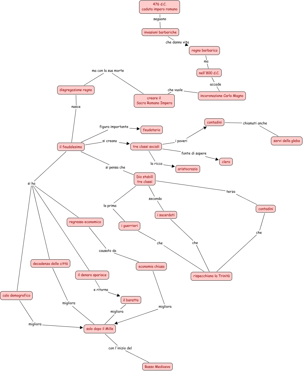 Questa Mappa Concettuale ha informazioni correlate a: alto medioevo (Sciamanna,Isawi,Mercuri,Torres), economia chiusa migliora solo dopo il Mille, tre classi sociali la ricca aristocrazia, tre classi sociali fonte di sapere clero, contadini che rispecchiano la Trinità, 476 d.C. caduta impero romano seguono invasioni barbariche, il feudalesimo figura importante feudatario, solo dopo il Mille con l'inizio del Basso Medioevo, incoronazione Carlo Magno che vuole creare il Sacro Romano Impero, contadini chiamati anche servi della gleba, regno barbarico ma nell'800 d.C.