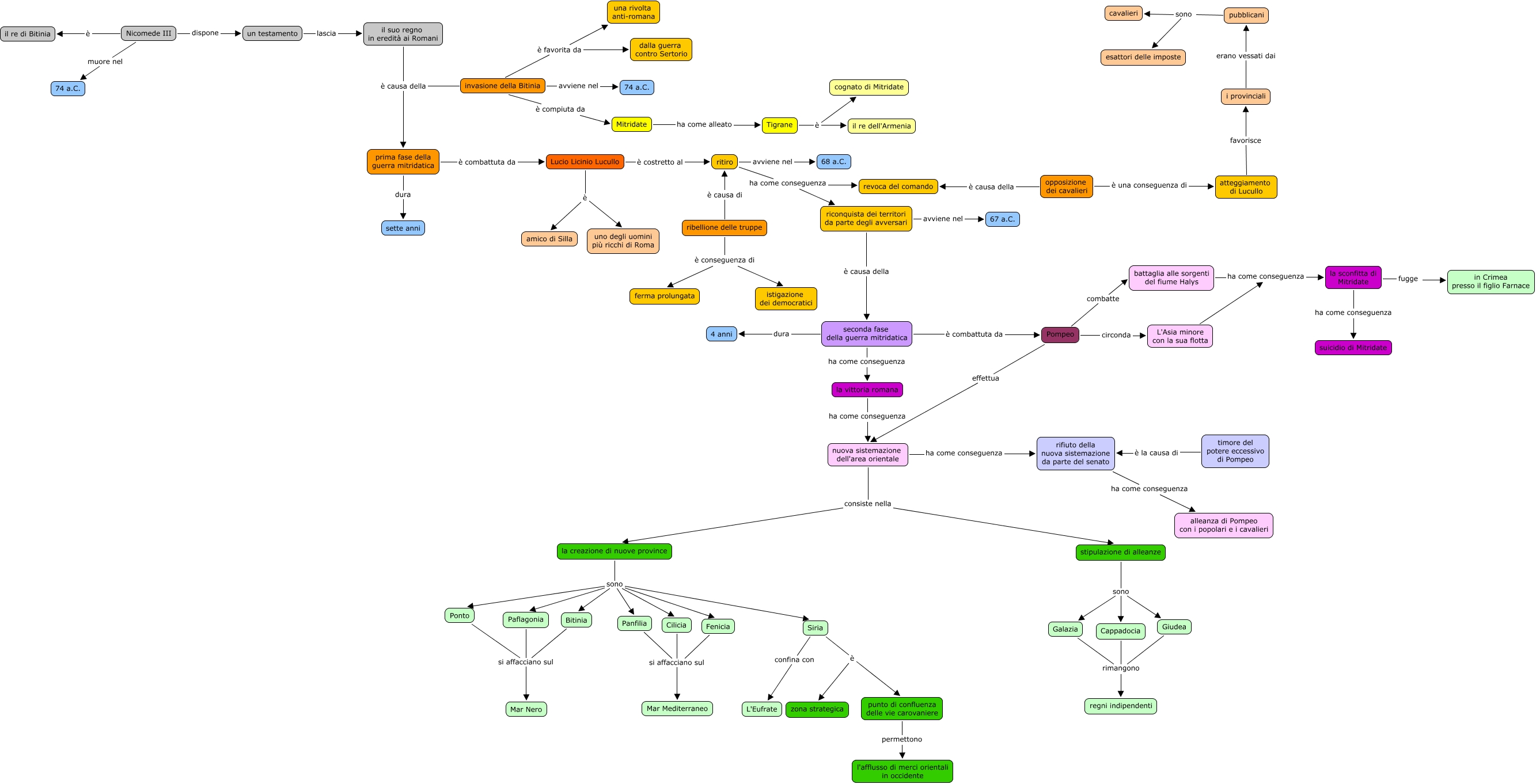 Questa Mappa Concettuale ha informazioni correlate a: Guerra mitridatica, Siria è punto di confluenza delle vie carovaniere, invasione della Bitinia è favorita da una rivolta anti-romana, seconda fase della guerra mitridatica dura 4 anni, Pompeo circonda L'Asia minore con la sua flotta, la creazione di nuove province sono Bitinia, Paflagonia si affacciano sul Mar Nero, la sconfitta di Mitridate ha come conseguenza suicidio di Mitridate, pubblicani sono cavalieri, stipulazione di alleanze sono Galazia, battaglia alle sorgenti del fiume Halys ha come conseguenza la sconfitta di Mitridate, prima fase della guerra mitridatica dura sette anni, Fenicia si affacciano sul Mar Mediterraneo, ritiro ha come conseguenza riconquista dei territori da parte degli avversari, nuova sistemazione dell'area orientale consiste nella stipulazione di alleanze, atteggiamento di Lucullo favorisce i provinciali, Tigrane è cognato di Mitridate, opposizione dei cavalieri è causa della revoca del comando, prima fase della guerra mitridatica è combattuta da Lucio Licinio Lucullo, punto di confluenza delle vie carovaniere permettono l'afflusso di merci orientali in occidente, Lucio Licinio Lucullo è uno degli uomini più ricchi di Roma