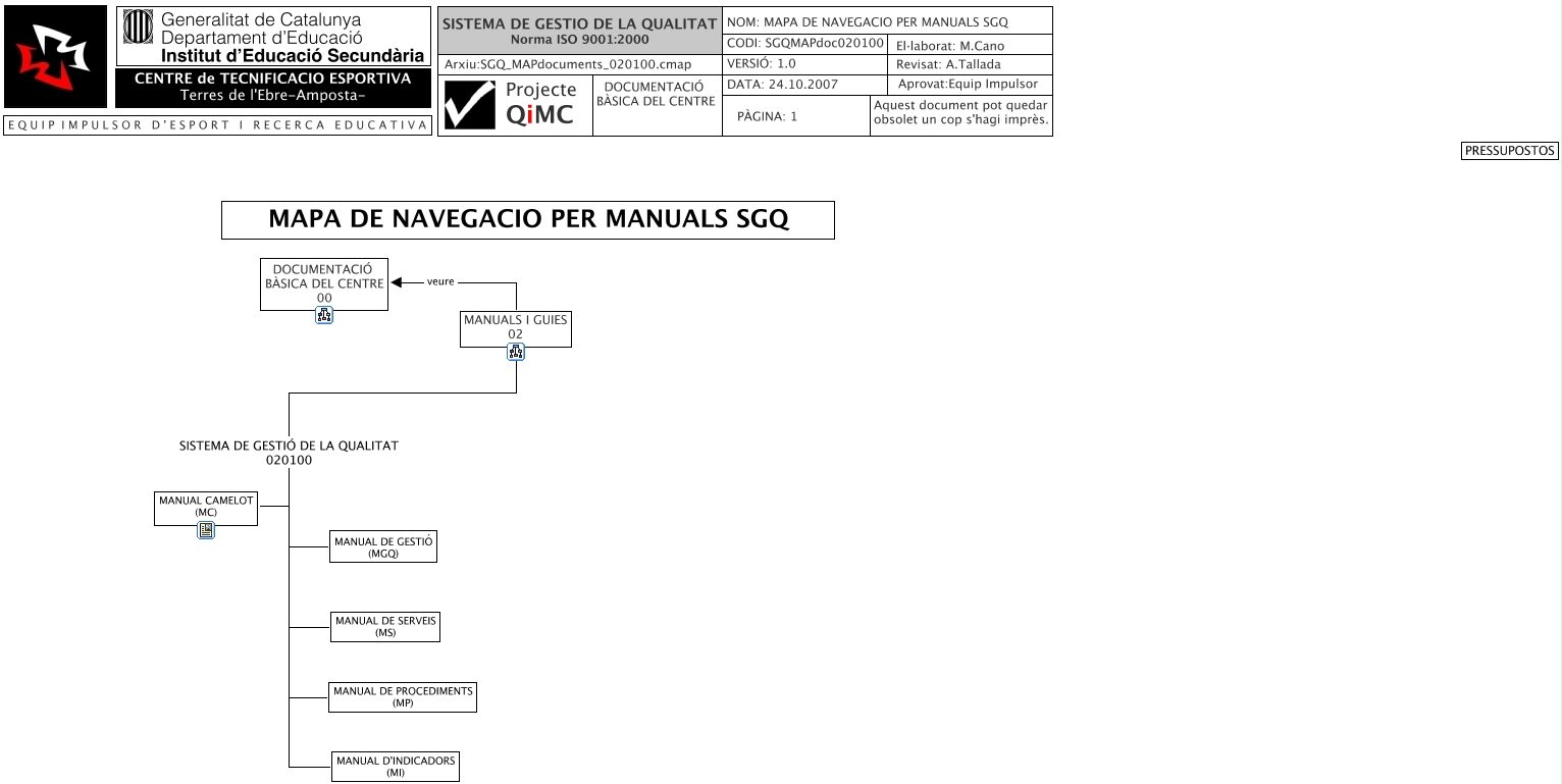 This Concept Map has information related to: SGQ_MAPdocuments_020100, MANUALS I GUIES 02 SISTEMA DE GESTIÓ DE LA QUALITAT 020100 MANUAL DE PROCEDIMENTS (MP), MANUALS I GUIES 02 SISTEMA DE GESTIÓ DE LA QUALITAT 020100 MANUAL D'INDICADORS (MI), MANUALS I GUIES 02 SISTEMA DE GESTIÓ DE LA QUALITAT 020100 MANUAL DE GESTIÓ (MGQ), MANUALS I GUIES 02 SISTEMA DE GESTIÓ DE LA QUALITAT 020100 MANUAL CAMELOT (MC), MANUALS I GUIES 02 SISTEMA DE GESTIÓ DE LA QUALITAT 020100 MANUAL DE SERVEIS (MS), MANUALS I GUIES 02 veure DOCUMENTACIÓ BÀSICA DEL CENTRE 00