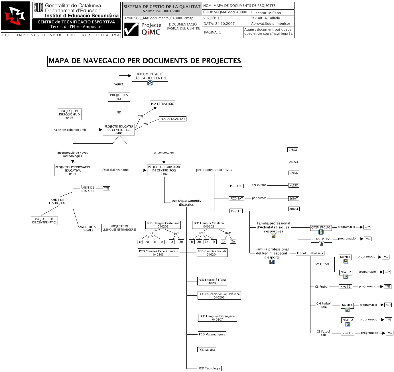 This Concept Map has information related to: SGQ_MAPdocuments_040000, Nivell 2 programacio ????, Nivell 1 programacio ????, PROJECTE CURRICULAR DE CENTRE (PCC) 0402 per departaments didàctics PCD Educació Física 040205, Futbol i futbol sala GM Futbol Nivell 2, PROJECTES 04 ???? PROJECTE EDUCATIU DE CENTRE (PEC) 0401, PROJECTE CURRICULAR DE CENTRE (PCC) 0402 per departaments didàctics PCD Educació Visual i Plàstica 040206, PCC-BAT per cursos 1rBAT, Futbol i futbol sala GS Futbol Nivell 3, PROJECTE EDUCATIU DE CENTRE (PEC) 0401 es concreta en PROJECTE CURRICULAR DE CENTRE (PCC) 0402, PCD Llengua Castellana 040201 BAT 1r